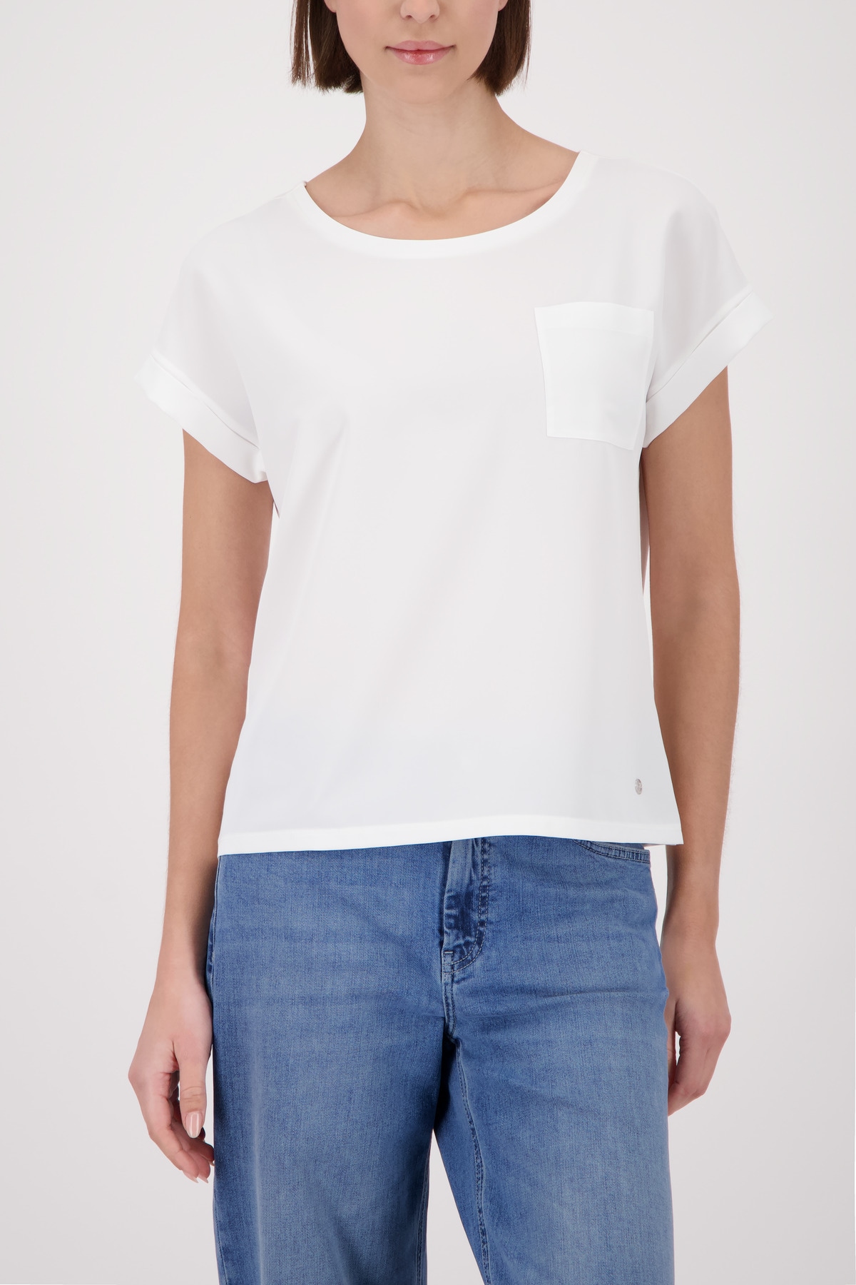 Aktuelle Schlupfbluse für Frauen von Monari mit funkelnder Strass-Verzierung. Mit einem taillenbedeckenden und normalen Schnitt. Der Ausschnitt zeigt sich mit Bündchen. Die Ärmel sind kurz. Das Oberteil ist pflegeleicht dank des widerstandsfähigen Webstoffs.