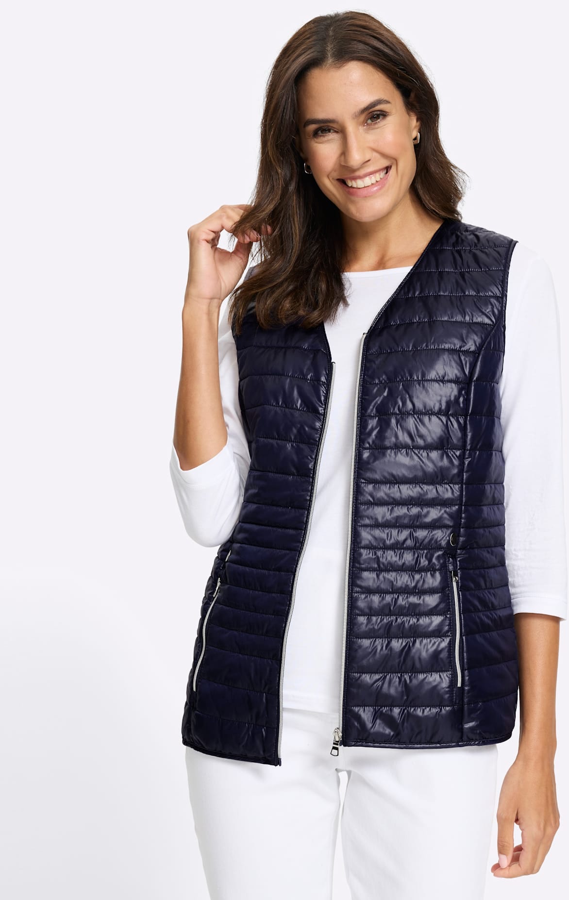 Diese figurumspielende Steppweste überzeugt mit ihrem modernen Uni-Design und praktischen Details. Der Zweiwege-Reißverschluss sowie die funktionalen Taschen machen sie zum perfekten Begleiter für Freizeit und Alltag. Leicht, bequem und vielseitig - ein Must-have für jede Garderobe!