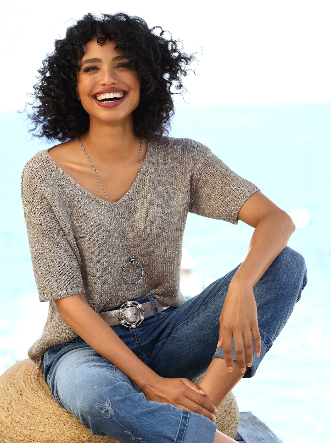 Die perfekte Masche für warme Tage: pflegeleichter und sorgfältig in Form gestrickter Kurzarm-Pullover aus leicht schimmerndem Bändchengarn. Mit V-Ausschnitt und kurzen Ärmeln. Abschlüsse mit schmalen Rippbündchen. 100% Polyacryl. Maschinenwäsche.