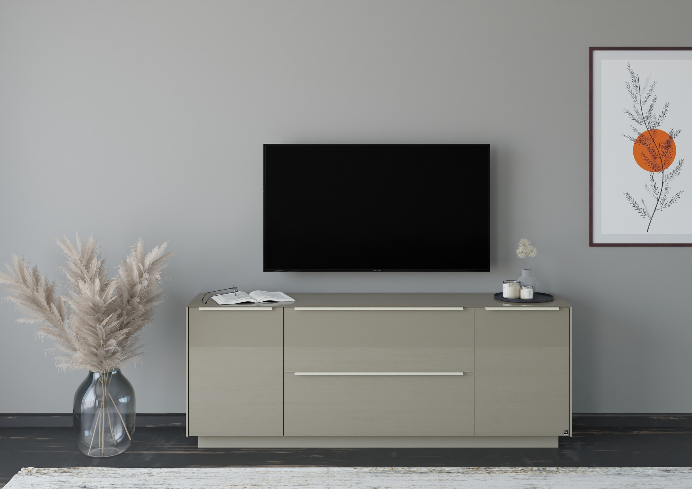 - Elegantes Lowboard mit glänzender Glasfront, Oberplatte und Metallgriffen
