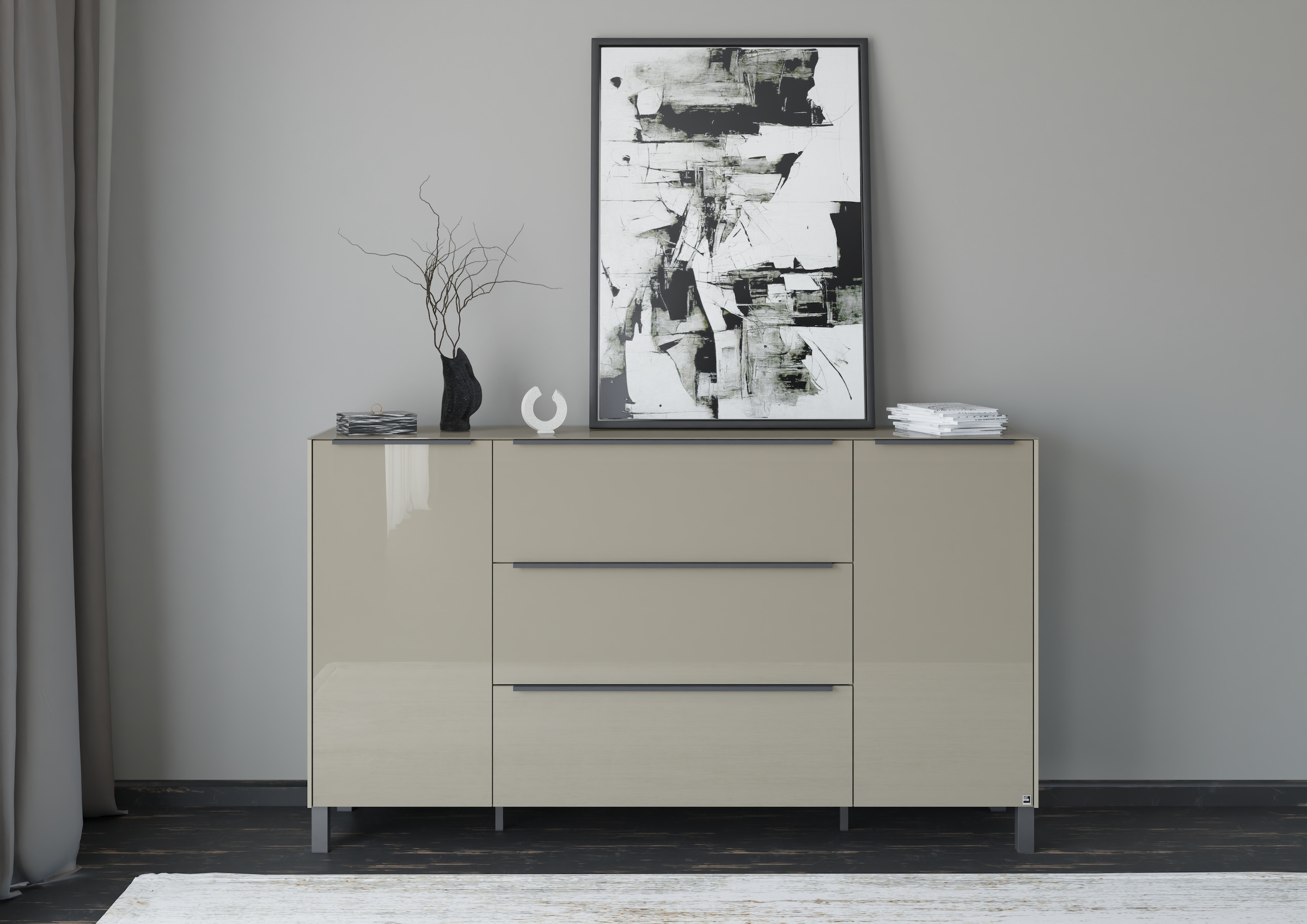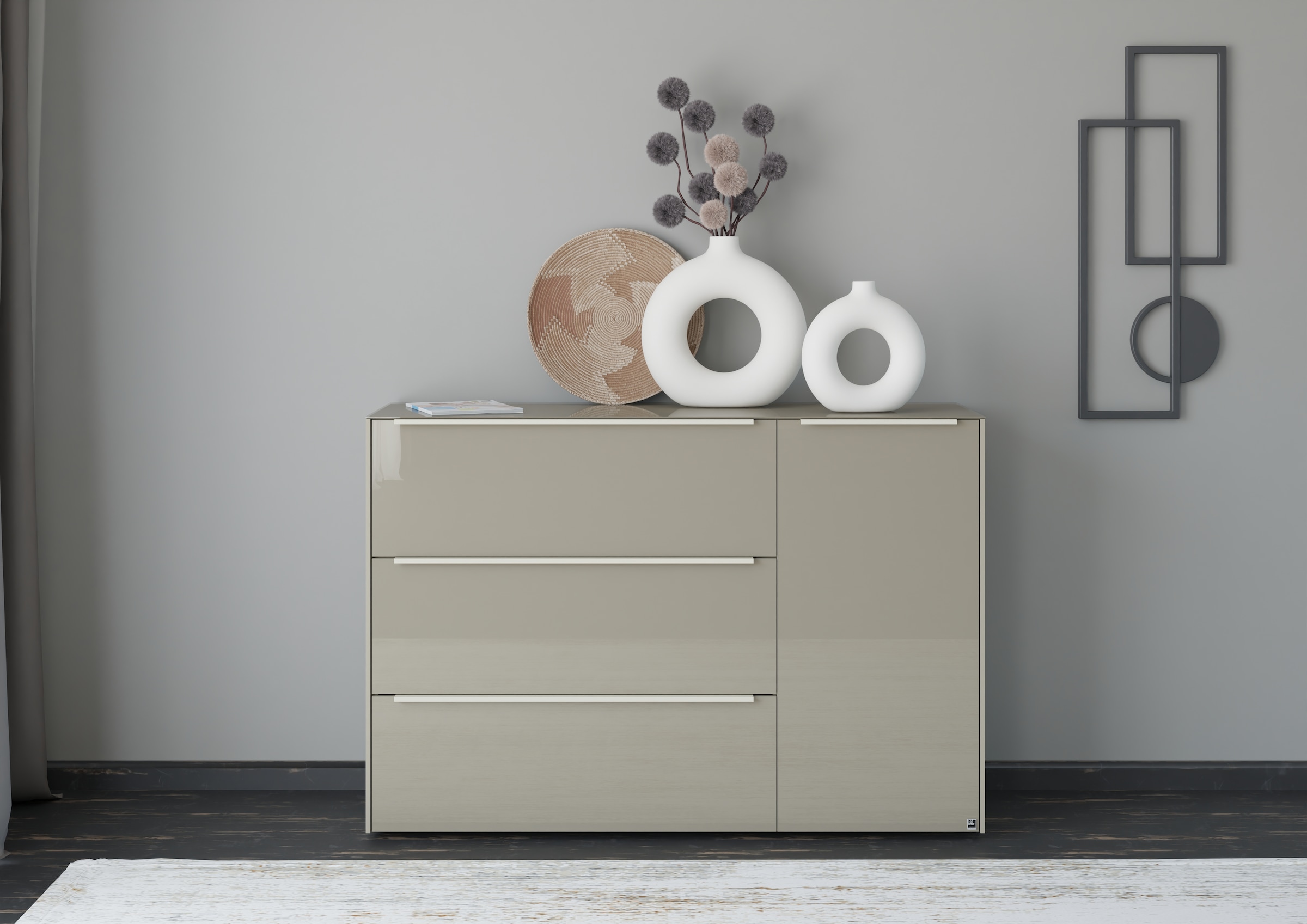 Ausführung | Griffe kaschmirfarben;Front und Oberplatte aus glänzendem Glas |