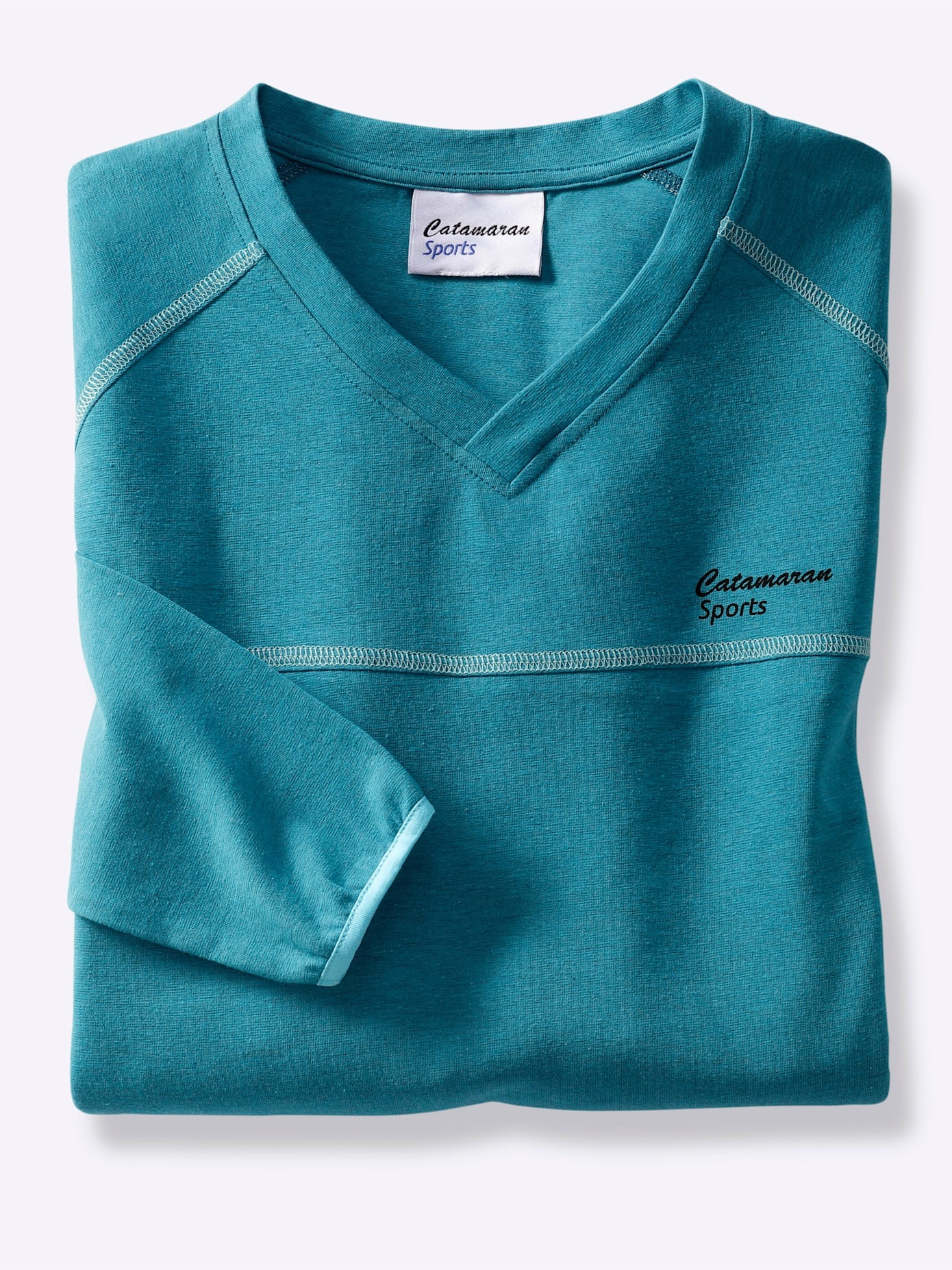 Funktions-Shirt von Catamaran Sports mit überlappendem V-Ausschnitt und langen Raglan-Ärmeln. Dekorativ die Flatlocknähte, auch an der Brustpasse. Elastische Kontrastpaspel an Ärmel- und Saumabschluss. 46% Baumwolle, 46% Polyester, 8% Elasthan. Maschinenwäsche.