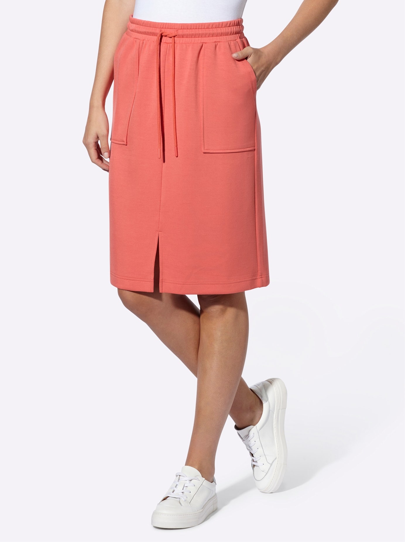 Jersey-Rock Lässig bequemer Kombipartner. Mit elastischem Bund, Tunnelzug und Bindeband. Aufgesetzte Taschen vorne, seitliche Kontraststreifen und Gehschlitz vorne. 55% Viskose, 40% Polyester, 5% Elasthan. Maschinenwäsche.
