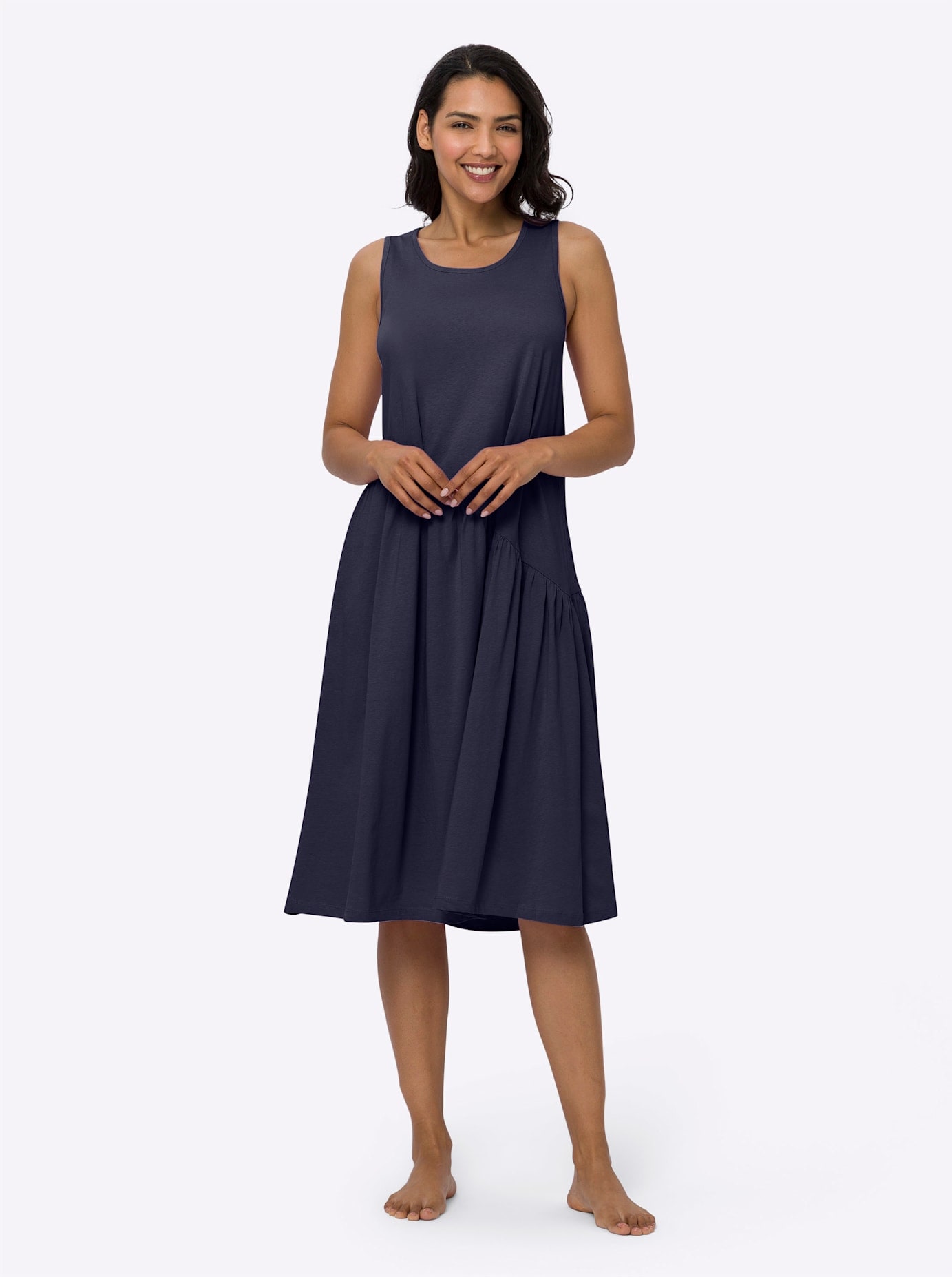Kleid Immer top gestylt. Rundhals-Ausschnitt mit offenem V und durchgehender, verdeckter Knopfleiste. Ärmellos. Taille mit elastischer Seitennaht, dekorativem Riegel und Falten. Unterstützt die Initiative Cotton made in Africa. 68% Baumwolle, 29% Polyamid, 3% Elasthan. Maschinenwäsche.