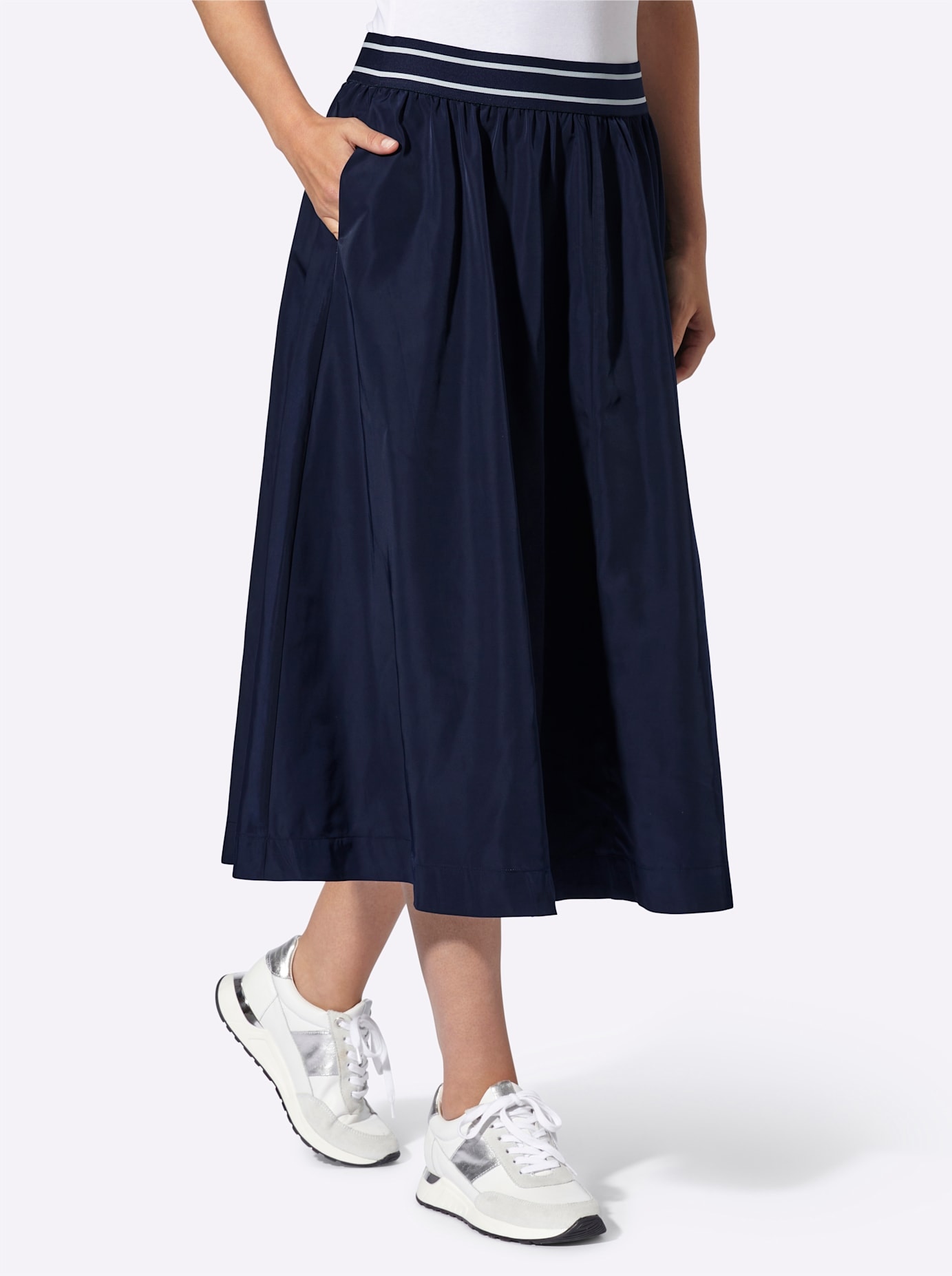 Sweatrock Lässig-bequem, mit Rundum-Dehnbund, Tunnelzug und Bindeband. Große aufgesetzte Taschen, Gehschlitz vorn. 55% Viskose, 40% Polyester, 5% Elasthan. Maschinenwäsche.