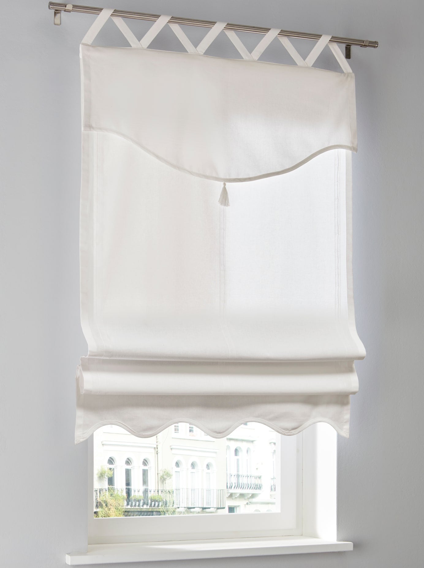 Raffrollo Blickdicht, in Leinen-Optik. Mit aufgesetzten Biesen. Wellenabschluss mit Quaste. Tunnel für die Gardinenstange. Unterstützt die Initiative Cotton made in Africa. 100% Baumwolle. Waschbar.