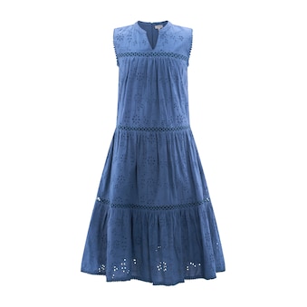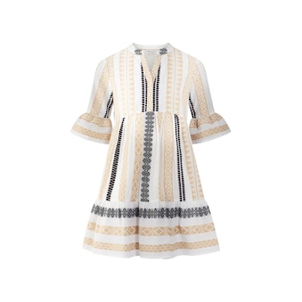 Luftig-fließendes Sommerkleid für Mädchen von happy girls by Eisend aus hochwertiger Viskose mit farbenfrohem Ethnodruck. Das Kleid ist blickdicht mit weichem Baumwollfutter gearbeitet und sorgt für angenehmen Tragekomfort an warmen Tagen. Ein Stufenrock mit zarter Zackenlitzen-Verzierung und kleine Ärmel verleihen dem Kleid einen verspielten, mädchenhaften Look. Der kleine Stehkragen, die verdeckte Knopfleiste und die dekorative Kordelquaste in der vorderen Taille setzen stilvolle Akzente. Der elastische Gummizug in der Taille sorgt für eine bequeme Passform und eine schöne Silhouette. Perfekt für Sommer, Freizeit und Urlaub.
