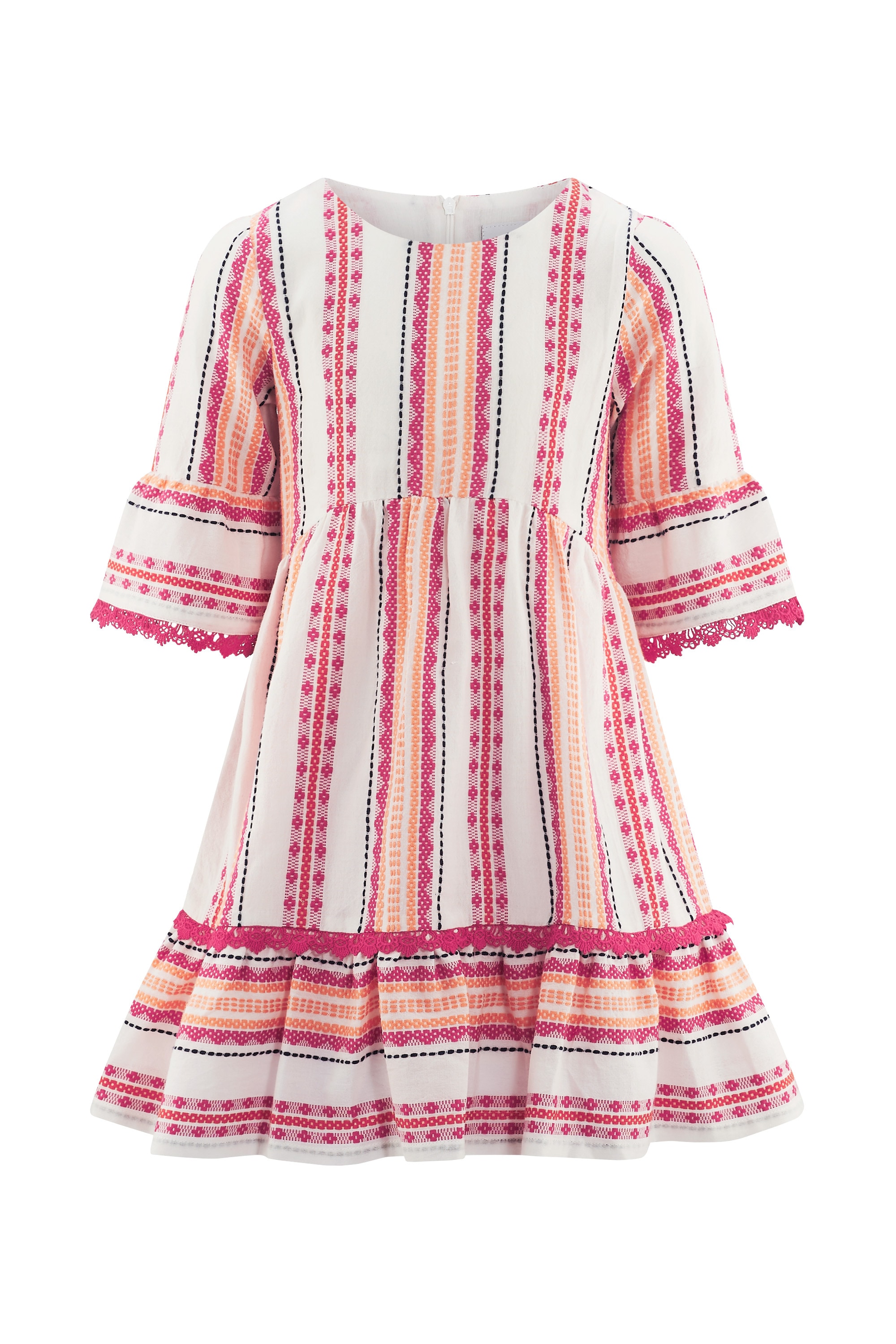 Harmonische Ethnostreifen verzieren das sommerliche Kleid von happy girls by Eisend. Das Mädchenkleid aus Baumwolle besticht durch den 3/4 Arm mit Rüsche, kleinen Stehkragen, verdeckte Knopfleiste und Stufenrock. Das weiter geschnittene Kleid ist angenehm zu tragen, auch an heißen Sommertagen.