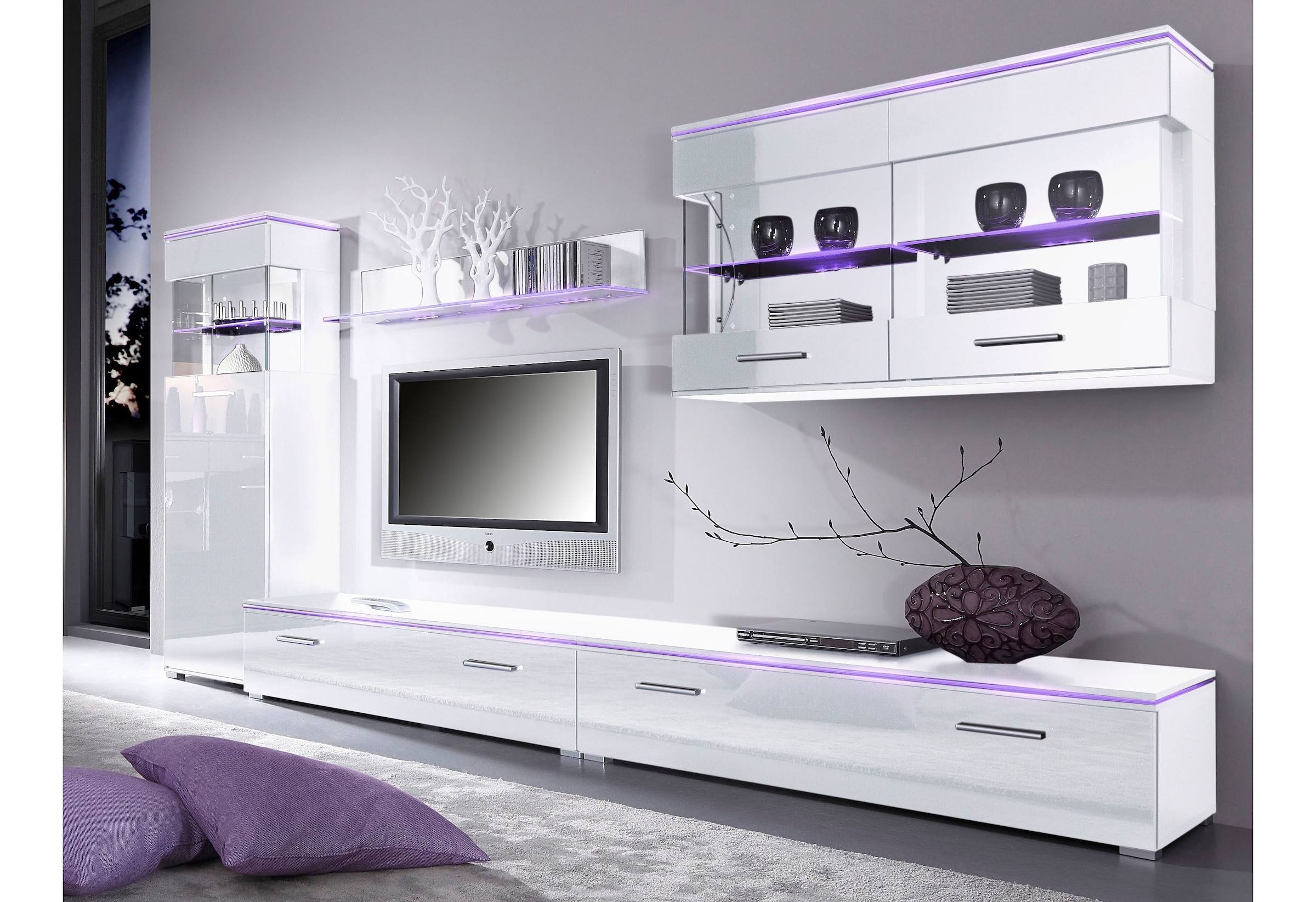 Set beinhaltet | Topmodernes Wohnprogramm mit tollen Lichteffekten. In 3 Farben: schwarz, grau oder weiß mit hochglänzenden Fronten. Rückwandpaneel matt. Klappen mit Bremshalterung. Schubkästen auf Metallschienen. 5-teilige Wohnwand bestehend aus: Beschreibung des 5-teiligen Wohnprogramms im Detail: Standvitrine: Seitliche Verglasung 1 Glas, 1 fester und 2 verstellbare Böden B/T/H: 50/32/148 cm Hängevitrine: 2 Türen mit 2 Glasböden B/T/H: 100/32/60 cm Lowboard: 1 Klappe mit Bremshalterung Innen zweigeteilt, Fachmaße: B/T/H: je 57/36/23 cm Tragkraft des Oberbodens max. 40 kg B/H/T: 120/30/40 cm Wandregal: 1 Glasablage B/T/H: 100/20/16 cm Gesamtmaße: Siehe Einzelelemente Alles ca.-Maße. Selbstmontage mit Aufbauanleitung. Beleuchtung bitte extra bestellen. Wir empfehlen für die Wohnwand 12er Set RGB-Glaskantenbeleuchtung (Artikelnummer: 689730) |