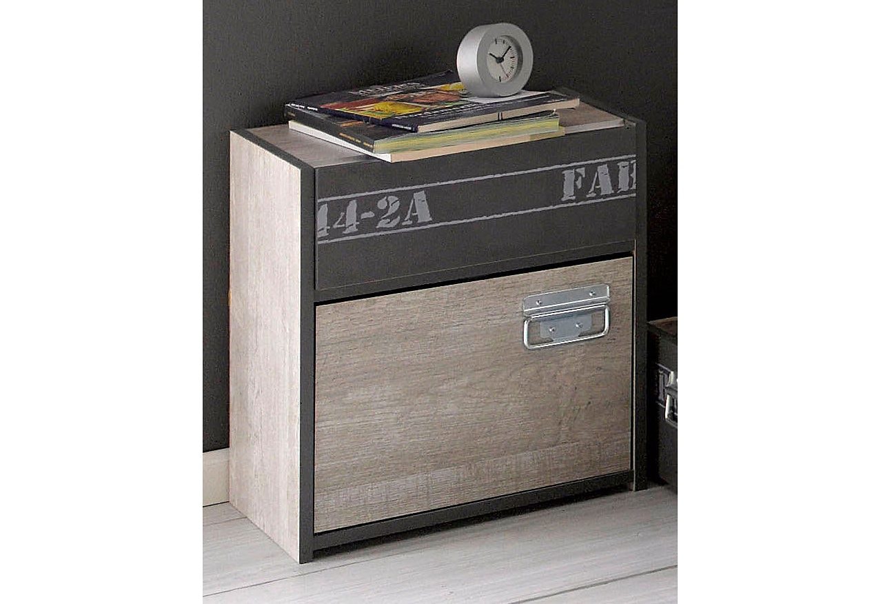 Wissenswertes | Cooles Jugendzimmer in Eschefarben mit grauen, melaminbeschichteten Absetzungen und bedruckten Elementen. Pflegeleichte Kunststoffoberfläche. Innendekor eschefarben. Beschläge und Scharniere aus Metall. Griffe zinkfarben, Metall. Mit 1 Schubkasten, Innenmaße (B/T/H): 33/24/6 cm und 1 Tür, Tür links oder rechts montierbar. Maße (B/T/H): 40/28/46 cm. Alle Maße sind Ca.-Maße. Mit Aufbauanleitung. |