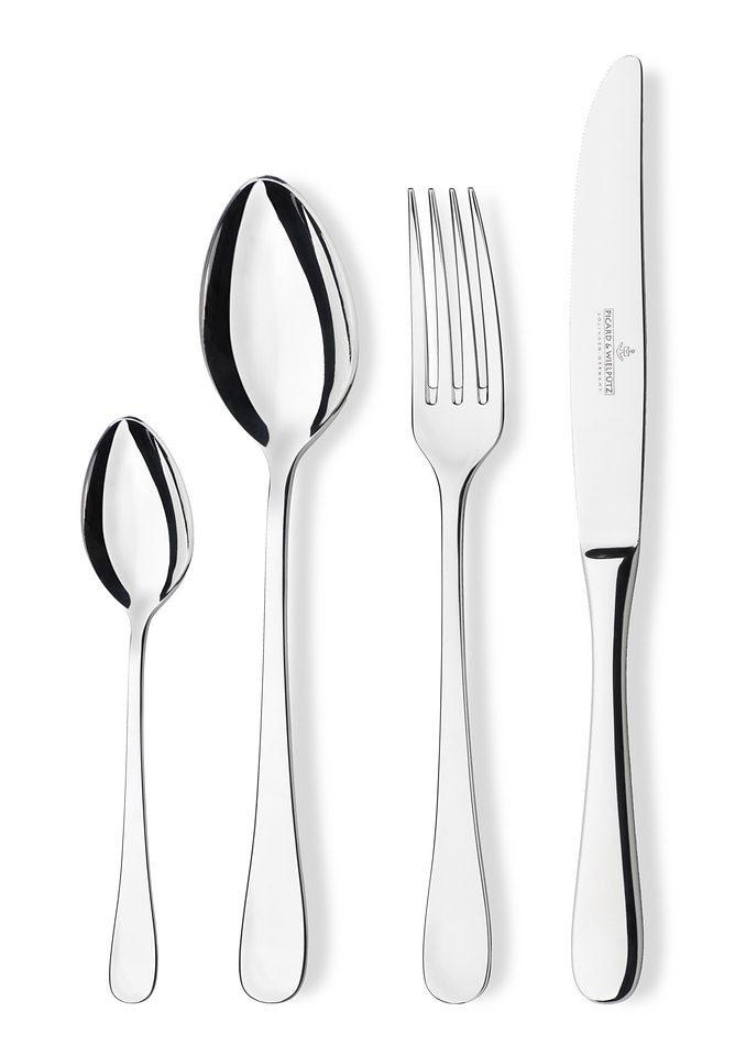 Besteckset, Picard & Wielpütz, »CHARISMA«. Gefertigt aus hochwertigem Chromnickelstahl 18/10, Solingen, ganz poliert. Massivmesser aus rostfreiem Chromstahl. Das Besteck ist spülmaschinengeeignet und in folgenden Zusammenstellungen erhältlich: 24-teilig: je 6 Menülöffel, Menügabeln, Menümesser und Kaffeelöffel. 30-teilig: je 6 Menülöffel, Menügabeln, Menümesser, Kaffeelöffel und Kaffeegabeln.