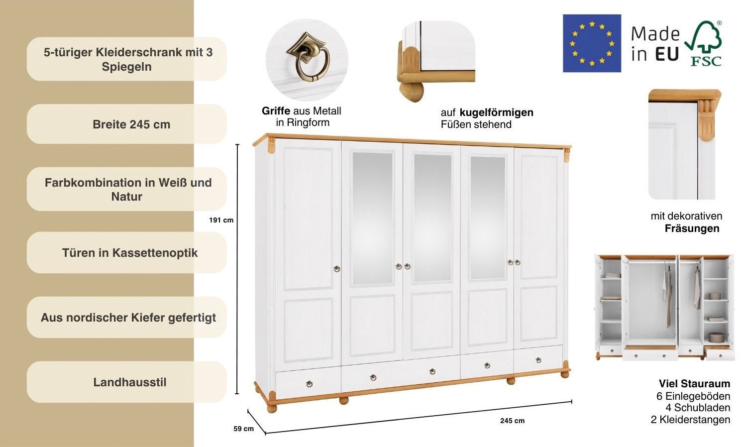 - Mit 6 Einlegeböden und 2 Kleiderstangen aus Kiefernholz