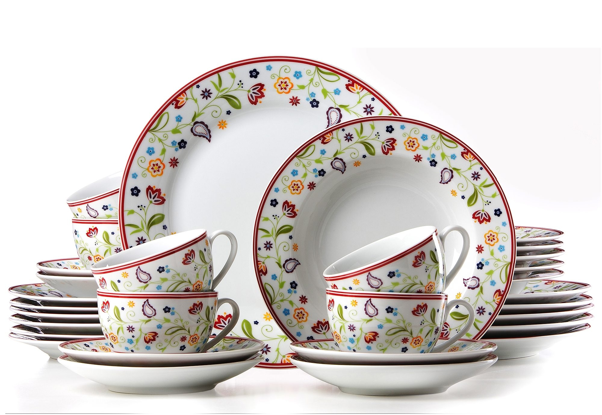 Kombiservice, Ritzenhoff & Breker. Kleine Blümchen - große Freude: Der farbenfrohe und erfrischend trendige Paisley-Blüten-Dekor verbreitet jeden Tag ein gehöriges Quantum gute Laune, gibt sich dank seiner liebevoll filigranen Gestaltung dabei zugleich angenehm unaufdringlich und überaus harmonisch. Paisley' bezeichnet übrigens ein abstraktes Floral-Muster, bei dem Blüten und Blätter mit einem spitz zulaufenden Ende in der Art eines überdimensionalen Kommas gestaltet sind. Die Porzellanserie ist aus hochwertigem, spülmaschinengeeignetem Porzellan gefertigt. Das 30-teilige Kombiservice besteht aus: 6 Kaffeetassen ca. 200 ml. 6 Untertassen Ø ca. 16,5 cm. 6 Desserteller Ø ca. 20,5 cm. 6 Suppenteller Ø ca. 22 cm. 6 Speiseteller Ø ca. 27 cm.