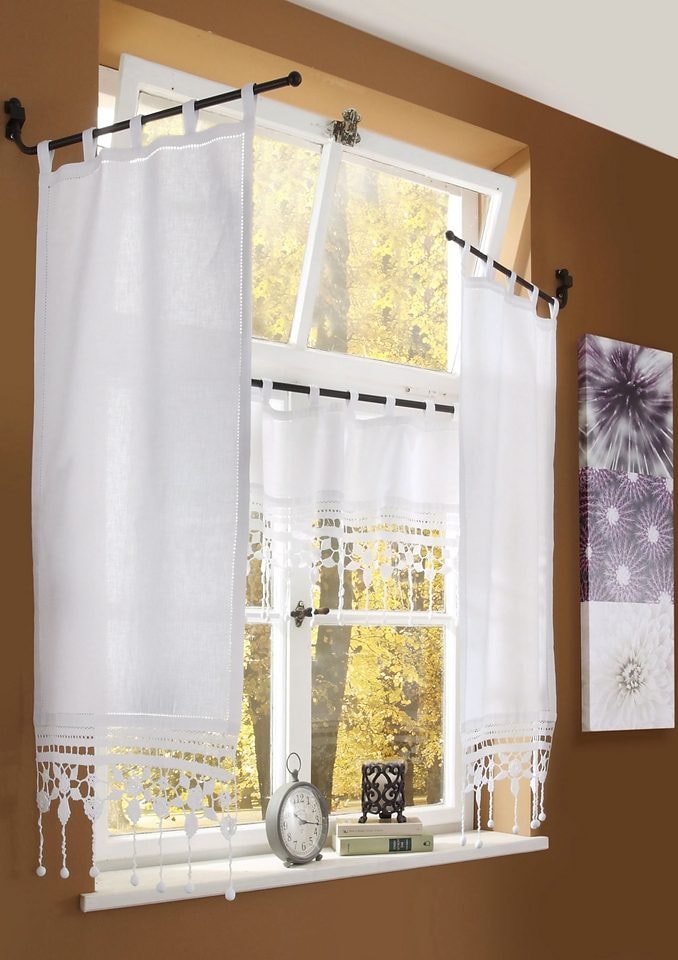 Dieser Querbehang von Hossner besticht durch seine aufwendige einzigartige handgehäkelte Spitze. Das verwendete leicht glänzende Mercerisierte Garn lässt den Querbehang sehr edel wirken. Durch die Bommeln am Abschluss verleiht er jedem Fenster einen ganz besonderen Shabby-Look. Als Aufhängung werden die Schlaufen verwendet, dadurch ist der Quebehang ohne großen Aufwand zu montieren und Sie werden viel freude daran haben.