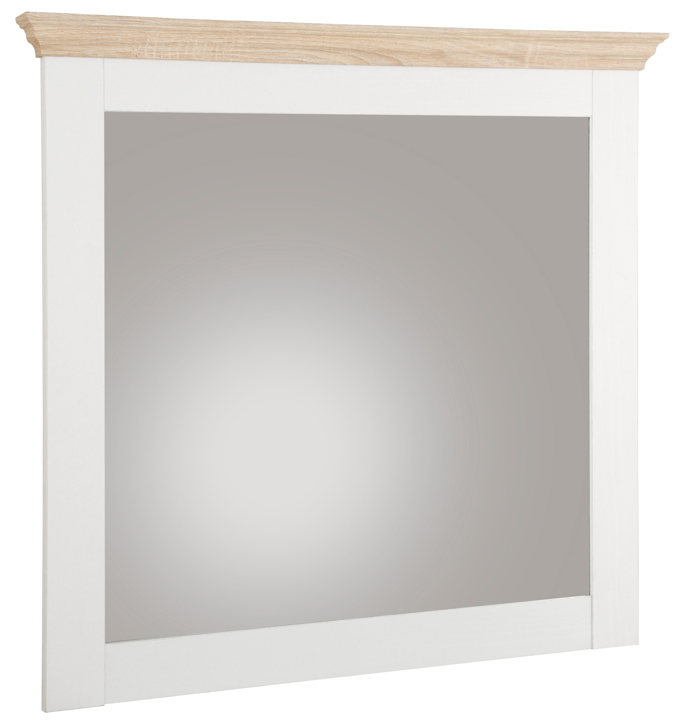 Spiegel »Binz« im modernen Landhaus-Stil. Aus FSC®-zertifizierter, folierter Spanplatte, wahlweise komplett eichefarben sägerau oder weiß mit Oberboden in eichefarben sägerau. Mit fühlbarer Struktur. Maße (B/T/H): 75/4/70 cm.