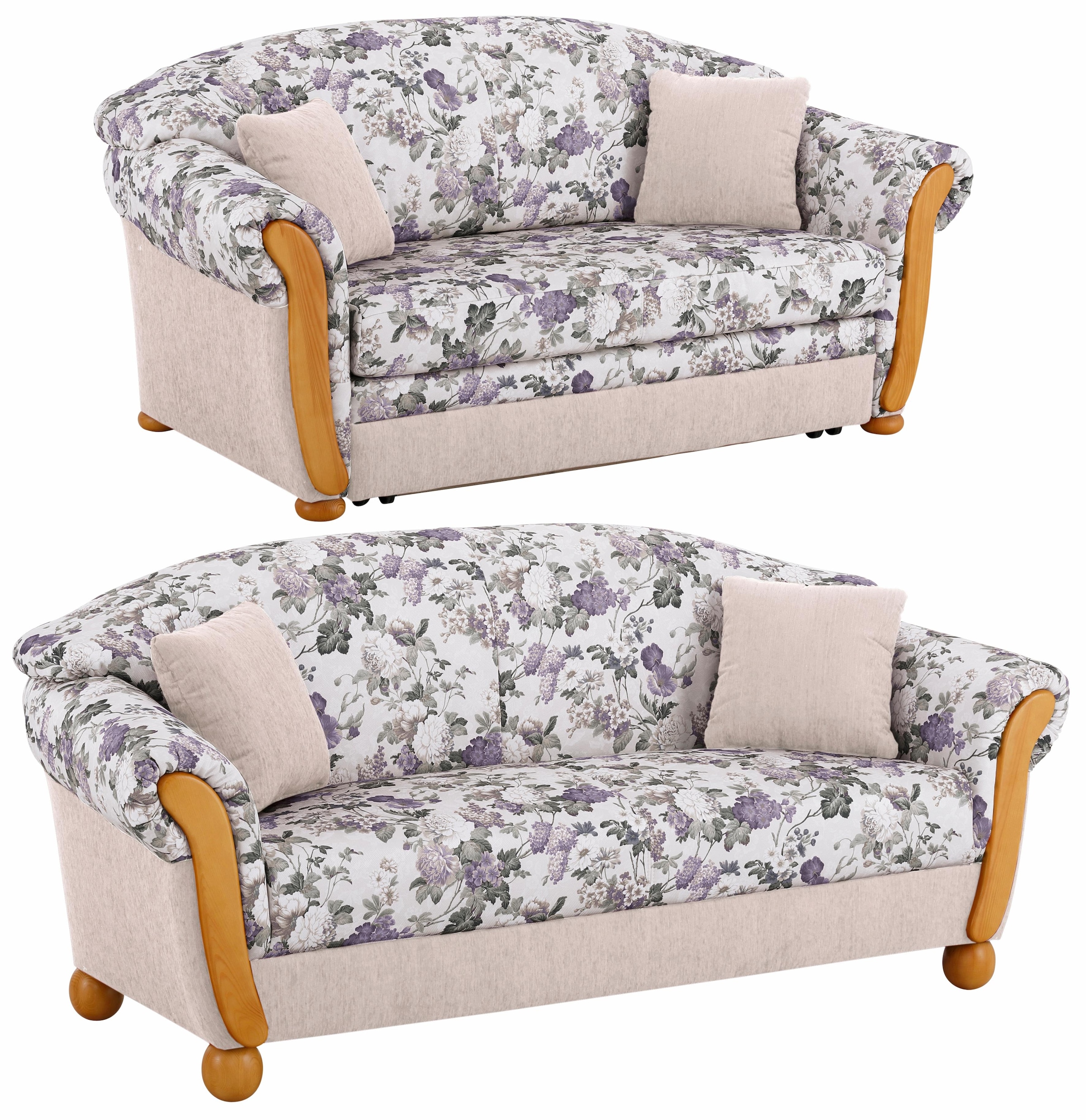 Wissenswertes | Mit dieser wunderschönen Garnitur bestehend aus einem 3-Sitzer und einem 2-Sitzer bringen Sie den natürlichen Landhaus-Charme in Ihren Wohnbereich! Das charmante Design wird unterstützt durch Applikationen aus Holz an Chatosen und Füßen. Diese Garnitur bietet viele Sitzmöglichkeiten und lädt zu gemütlichen Stunden am prasselnden Kaminfeuer ein. Für einen optimalen Sitzkomfort sorgt der klassische Sitzaufbau. Für langlebigen Komfort sorgt der hochwertige Federkern, welcher zusätzlich von einer Wellenunterfederung unterstützt wird. Für dennoch bequemes und weiches Sitzgefühl sorgt eine Schaum- und Vliesabdeckung. Die nötige Stabilität bietet ein hochwertiges Holzuntergestell, das seinen Beitrag leistet, da es aus FSC-zertifiertem Anbau stammt. Sie können zwischen zwei verschiedenen Bezugsvarianten wählen. Ob in dezentem Uni mit leichten blumigen Akzenten durch die Zierkissen oder in voller nostalgischer Pracht, in jedem Fall ist dieses Möbel eine gute Wahl! Details: |