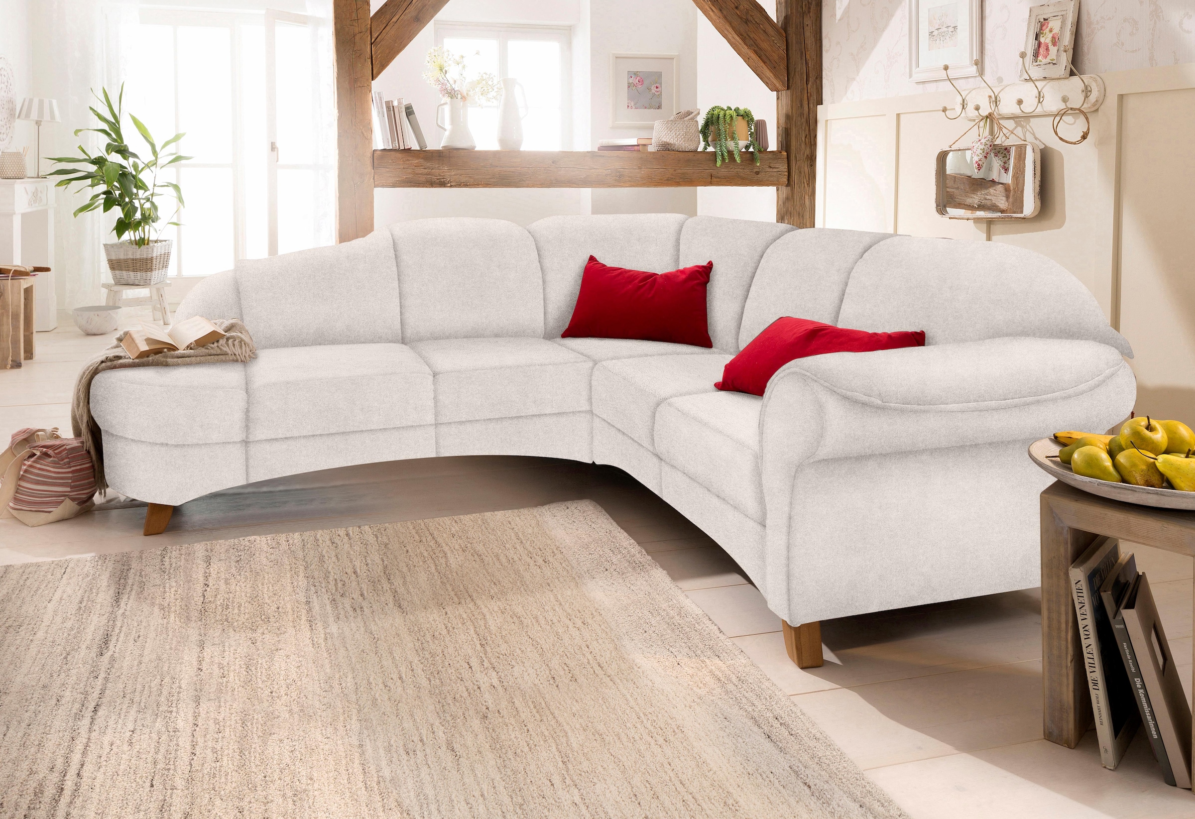 Modernes Polsterprogramm im Landhaus-Stil. Den hohen Sitzkomfort unterstützen die komfortable Wellenunterfederung, Federkern, atmungsaktive Polyätherschaum-Polsterung und das stabile Holzuntergestell aus FSC®-zertifiziertem Holzwerkstoff. Das trendige Design und die hochwertige Verarbeitung erfüllen alle hohen Ansprüche.
