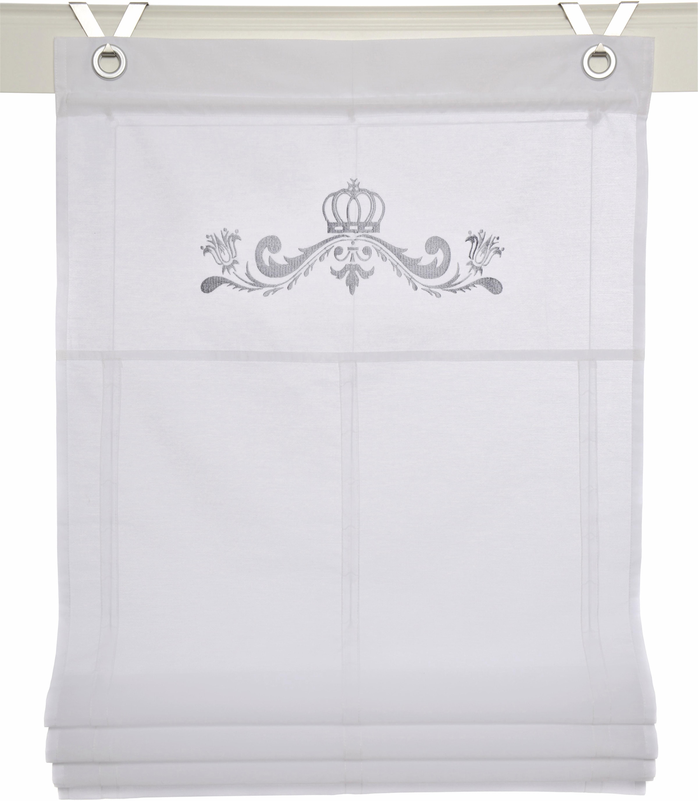 Kutti Raffrollo »Kessy Crown« mit Hakenaufhängung ohne Bohren Ösenrollo, weiß, blickdicht, bestickt, Motiv, Krone, silber
