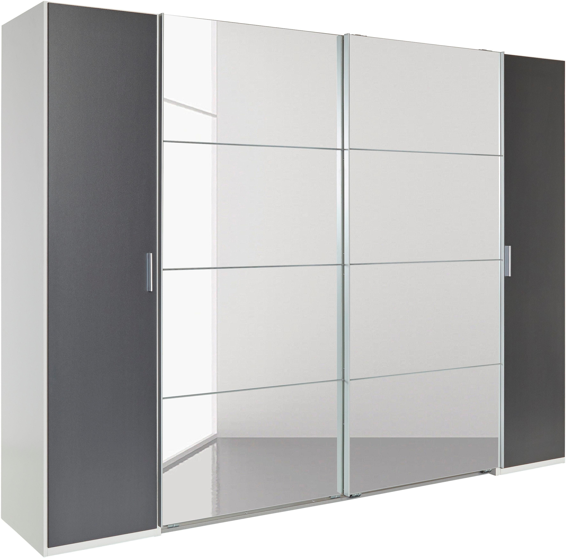 Drehtürenschrank oder Schwebetürenschrank? Mit diesem geräumigen Kleiderschrank stellt sich diese Frage nicht, denn der ist eine tolle Kombination aus beidem. So bietet er, optisch reizvoll verpackt, extra viel Stauraum: Hinter den beiden breiten Schwebetüren in der Mitte befinden sich mehrere große Schranksektionen, von der jede mit einer Ablagefläche sowie einer Kleiderstange ausgestattet ist. In den seitlichen Schrankteilen befinden sich hinter den Drehtüren zahlreiche Ablagefächer, die reichlich Platz für Shirts, Pullover und Hosen bieten. Optisch überzeugt der Schrank durch seine reizvolle Farbkombination und die schicken Griffleisten aus Metall. Erhältlich mit Spiegelelementen.