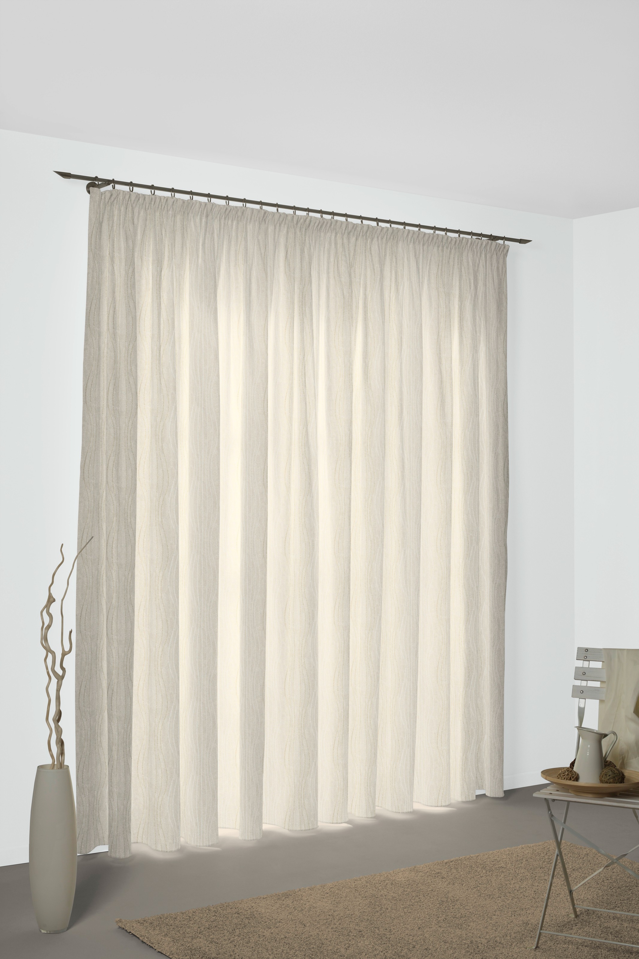 RICCIA, der Designvorhang von Georg Chr. Wirth. Durch seine erstklassige Webart mit den raffinierten Bindungseffekten wirkt der Vorhang hochwertig bestickt. Zudem verleihen erlesene metalisierte Garne diesem Vorhang seinen besonderen Charme. Mit Ösen lässt sich der Vorhang ganz leich montieren. Erleben Sie unseren Vorhang RICCIA.