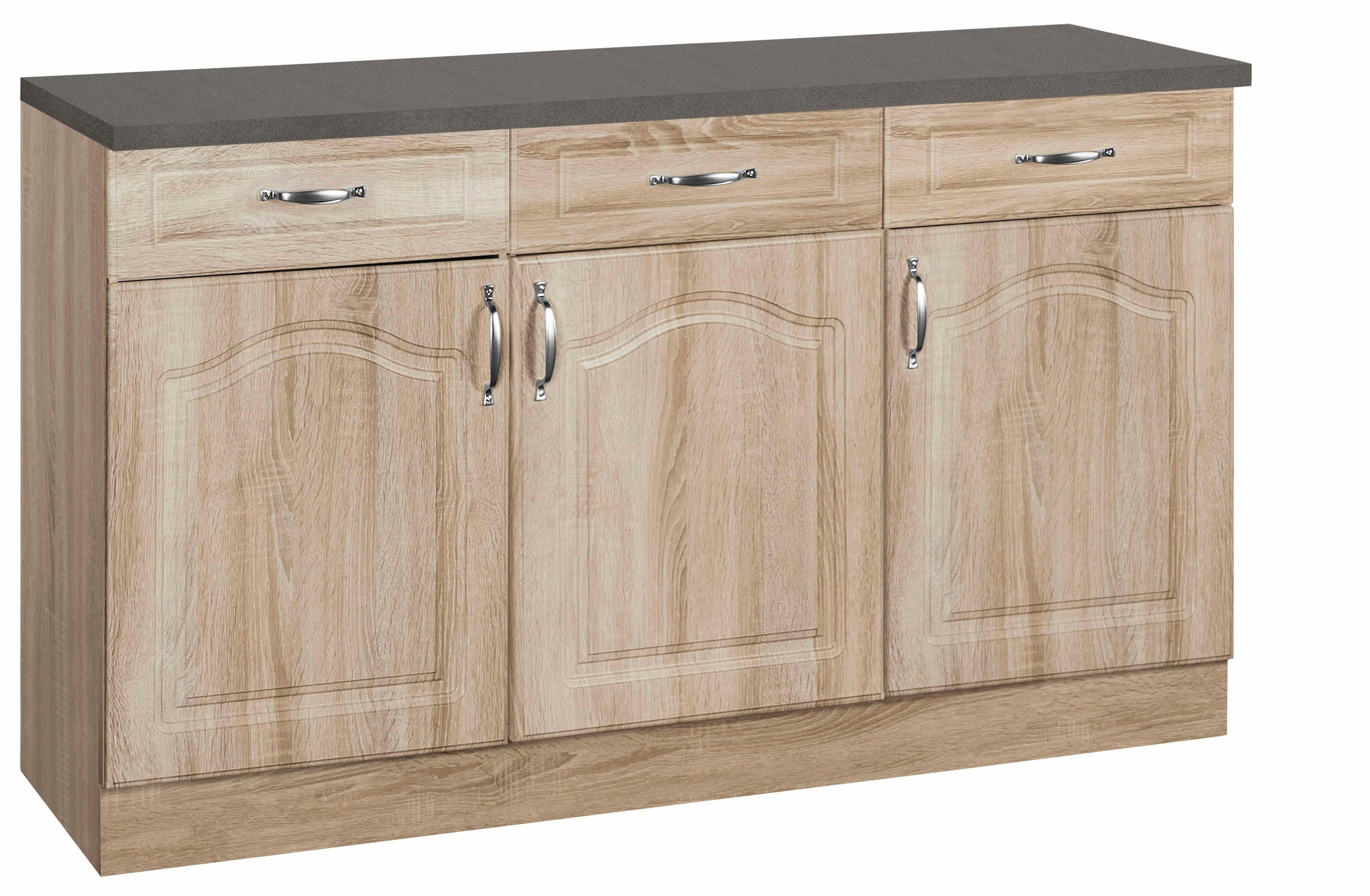 Farbbezeichnung | Front: Landhaus Eiche, Korpus: Sonoma Eiche, Arbeitsplatte: Granit Grau |