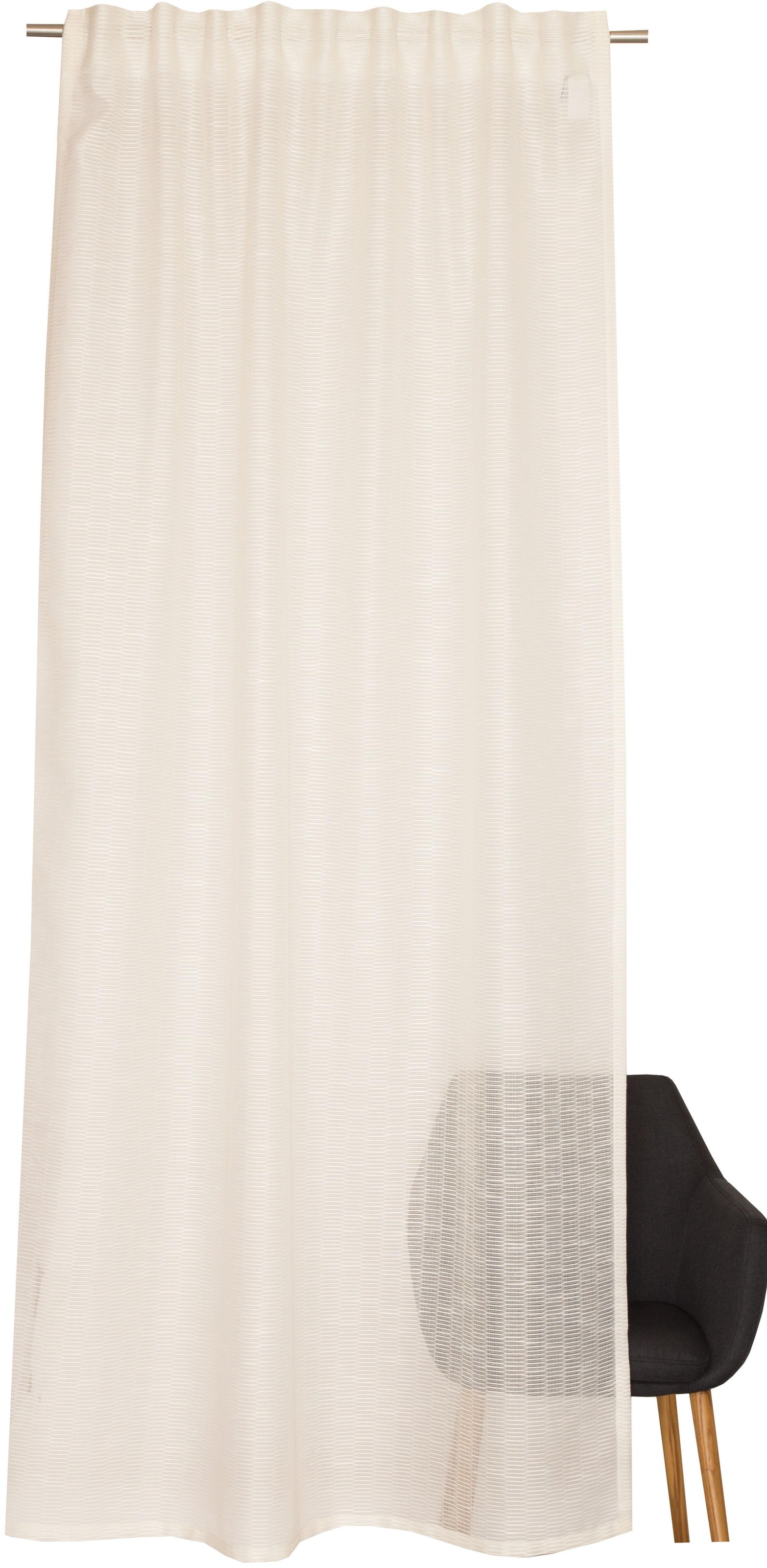 Fertigvorhang mit verdeckten Schlaufen-Kombiband, gewebte transparente Netzoptik.