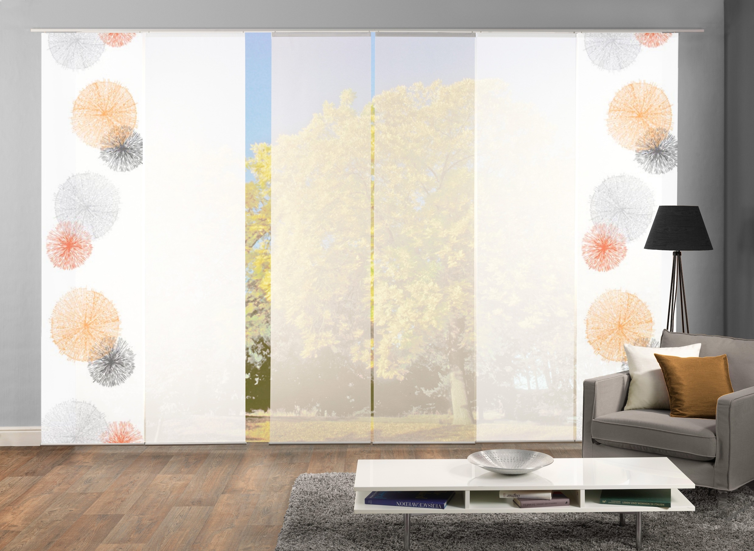 Schöne moderne SchiebevorhangSets der Marke HOME WOHNIDEEN. Die Schiebevorhänge bestehen aus 100% Polyester. Sie werden inkl. Paneelwagen und Klemmleiste geliefert. Sets können bestehen aus 3, 4, 5 oder 6 Schiebevorhängen, digitalbedruckte aber auch Unifarbene, blickdicht wie auch halbtransparent.