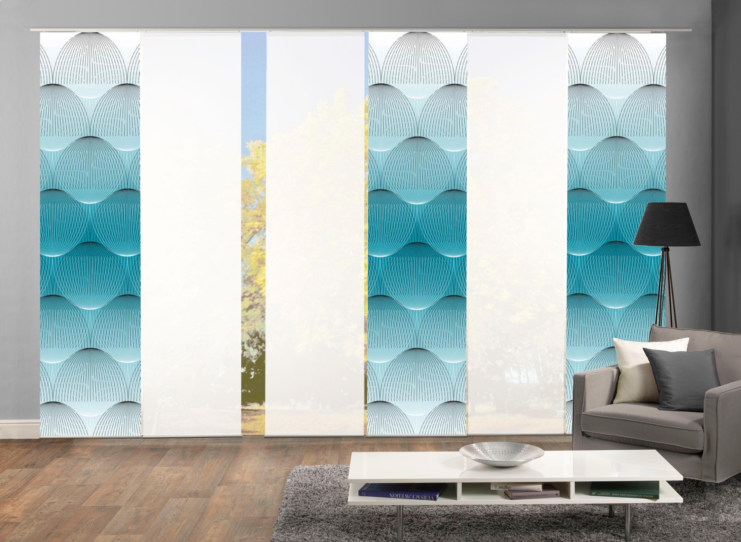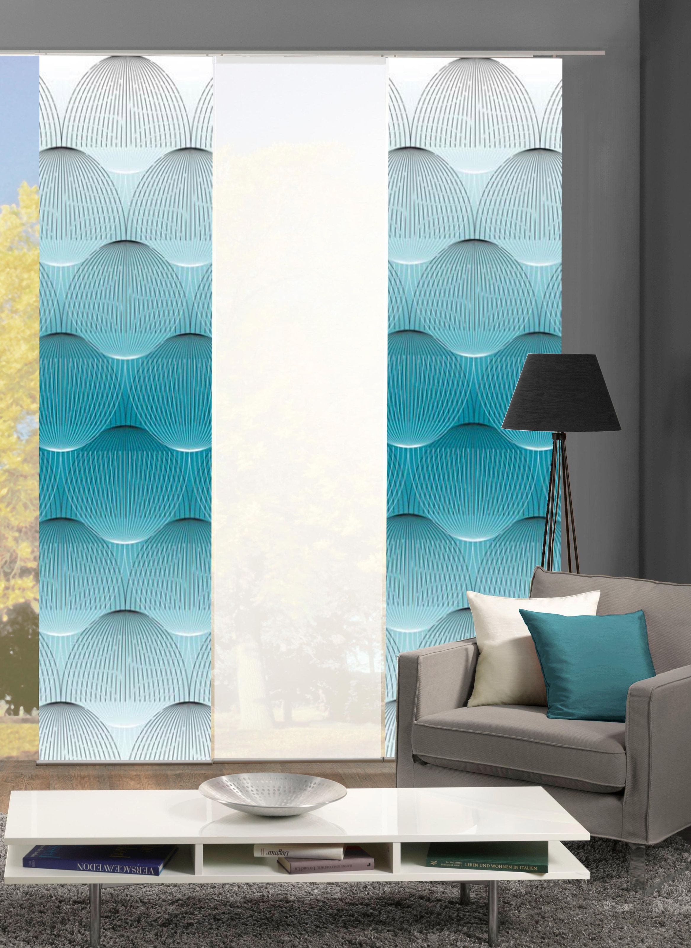 Schöne moderne SchiebevorhangSets der Marke HOME WOHNIDEEN. Die Schiebevorhänge bestehen aus 100% Polyester. Sie werden inkl. Paneelwagen und Klemmleiste geliefert. Sets können bestehen aus 3, 4, 5 oder 6 Schiebevorhängen, digitalbedruckte aber auch Unifarbene, blickdicht wie auch halbtransparent.