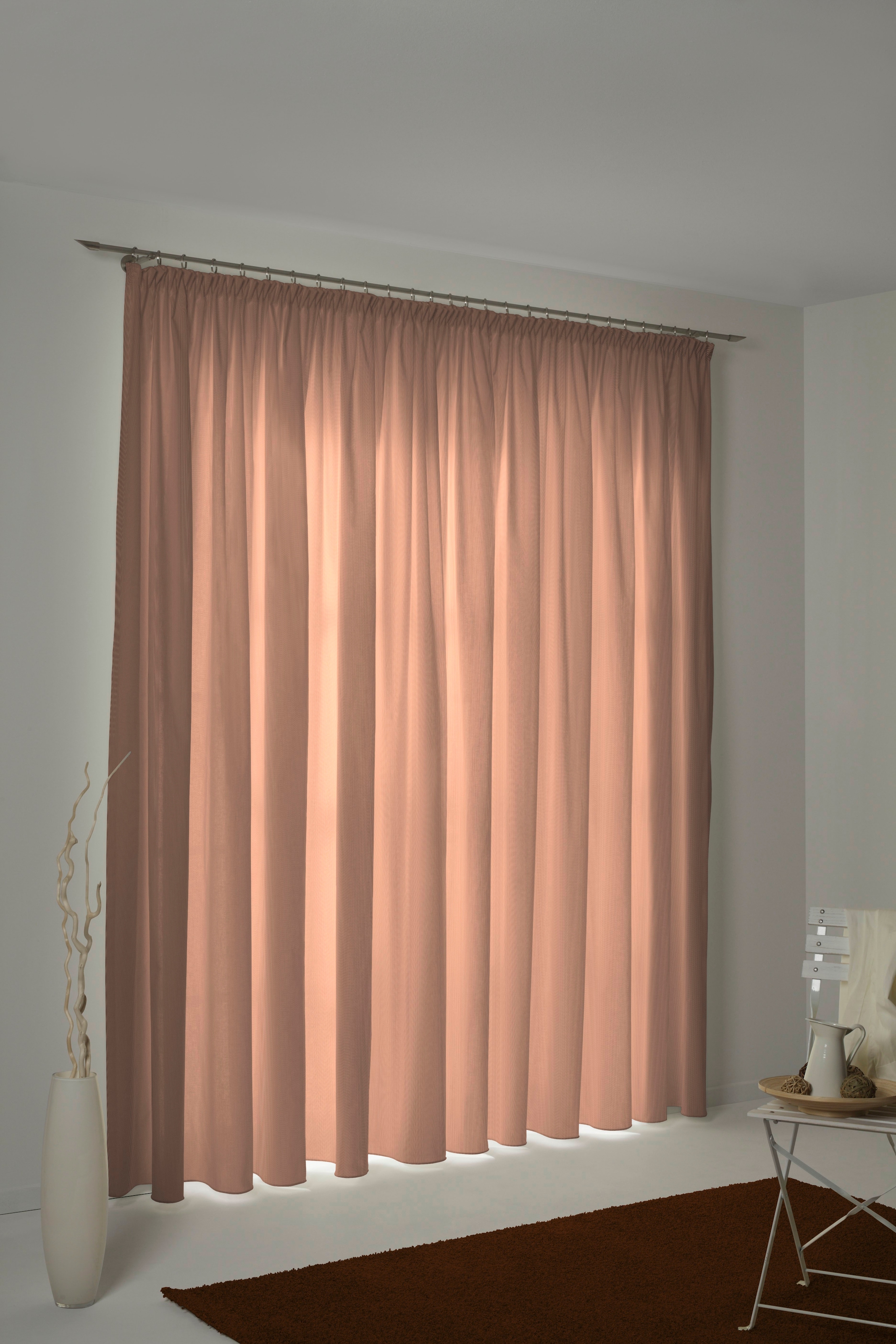 - Aufhängung: Mit Kräuselband für eine gleichmäßige Faltenlegung und flexible Anbringung