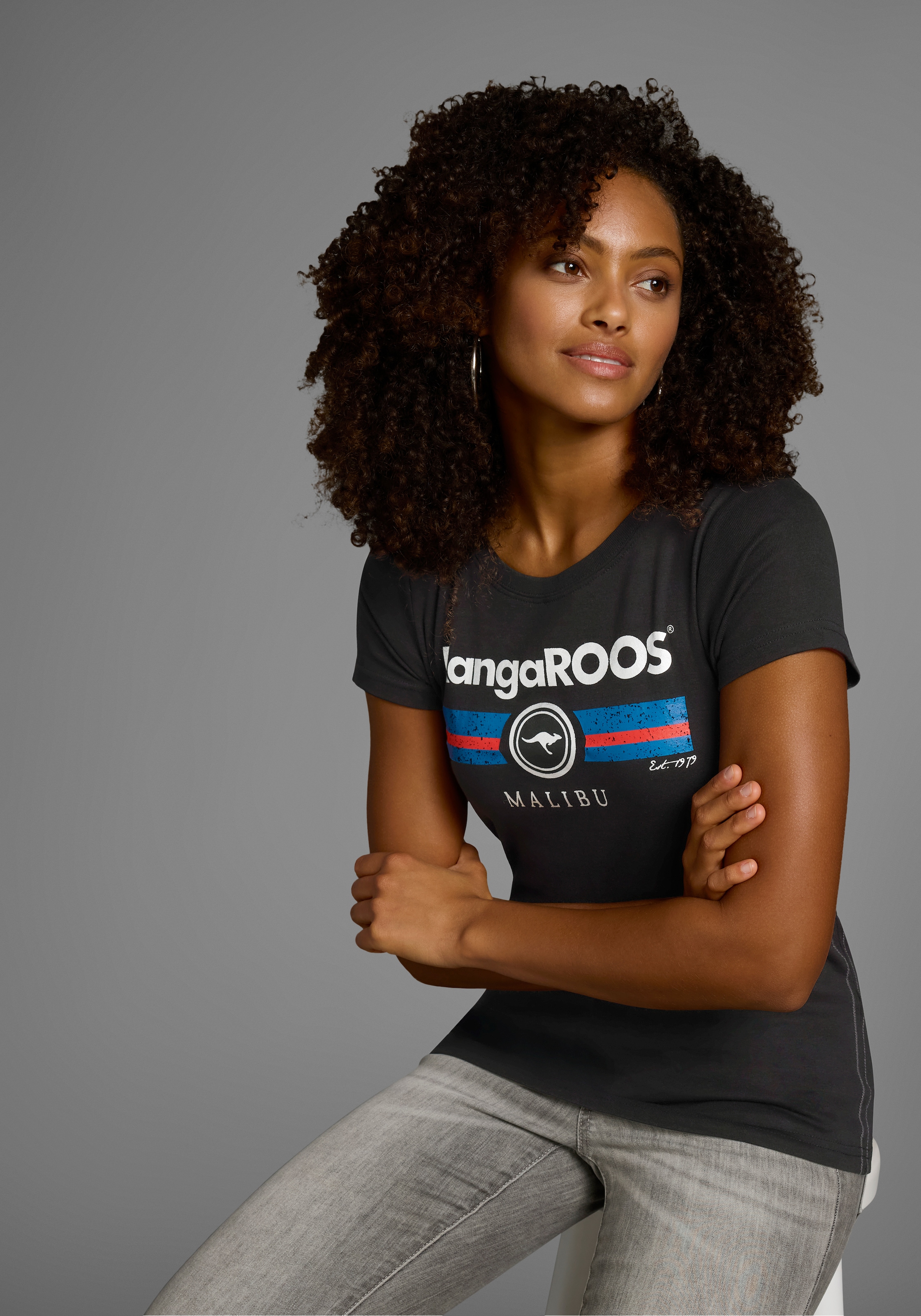 Klassisches Damen-T-Shirt von KangaROOS mit aufgedruckten Highlights. Mit einem hüftbedeckenden und sehr eng anliegenden Schnitt. Der Ausschnitt zeigt sich mit einem Rippbündchen. Durch das elastische Ripp-Material passt sich das Oberteil den Bewegungen an.