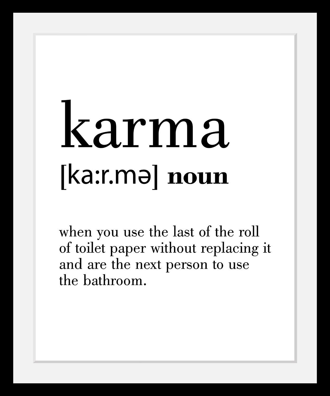 Moderner Dekoartikel: Das Bild mit Rahmen »Karma« im modernen Stil wird viele Betrachter zum Schmunzeln bringen. Der Kunstdruck ist mit einem aufheiternden Spruch zum Thema »Karma« gestaltet. Dabei ist das Layout so gewählt, als handele es sich um einen Textauszug aus dem Lexikon. Das Motiv ist im High End Print auf Diamond HQ Fotopapier erstellt. Das Passepartout setzt das Bildelement wunderschön in Szene. Zudem ist der Kunstdruck hinter einer Acrylglasscheibe geschützt. Die Dekoration ist in mehreren Größen erhältlich. Aufgrund seines Motivs ist das Bild mit Rahmen »Karma« im modernen Stil auch für das Badezimmer geeignet.