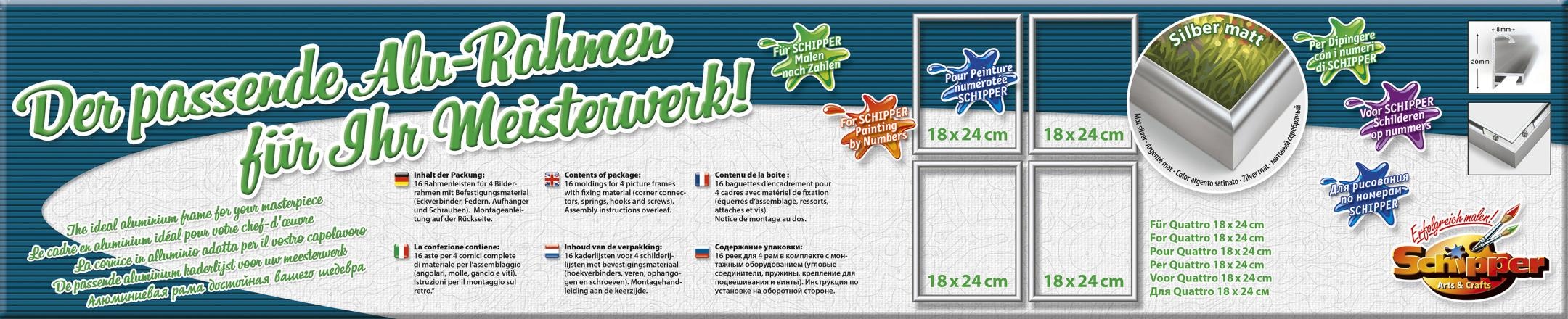 Die »Malen nach Zahlen, Alurahmen Quattro 18x24 cm, silberfarben matt« sind der beste Weg für angehende Künstler, um ihre Werke optimal in Szene zu setzen. Die vier matten, silberfarbenen Rahmen werden mit Eckverbindern, Federn, Aufhängern und Schrauben geliefert. Die Rahmen im praktischen 4er Set sind für Schipper Malen nach Zahlen Quattro diesen Formats geeignet.
