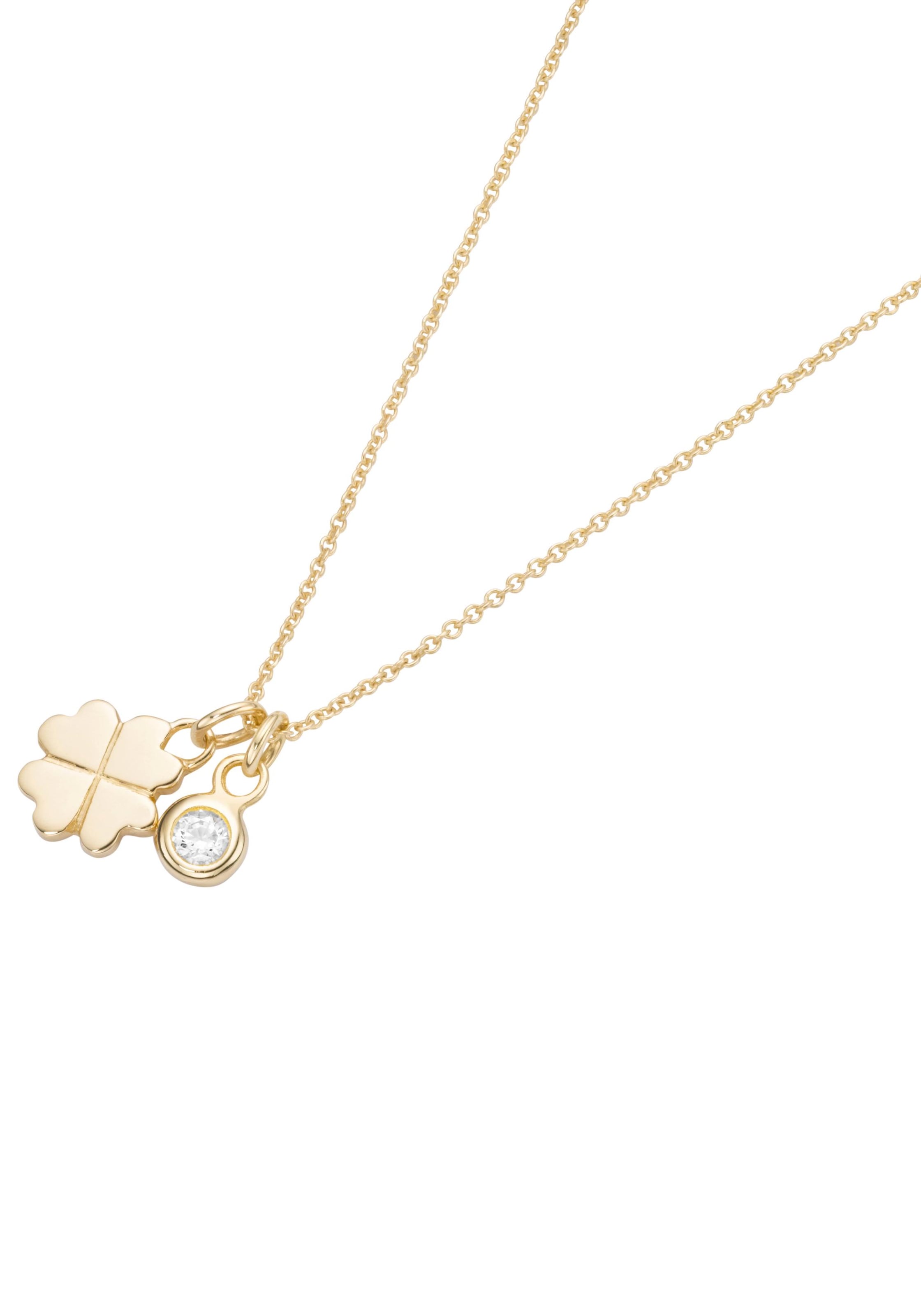 Ein kleiner Glückbringer in Form einer Halskette. Der Kleeblatt-Anhänger wird von einem weiteren Anhänger mit Zirkonia (synth.) begleitet und unterstreicht so das stimmige Gesamtbild. Der Halsschmuck schmiegt sich wunderbar ans Dekolleté und unterstreicht Ihren Look.
