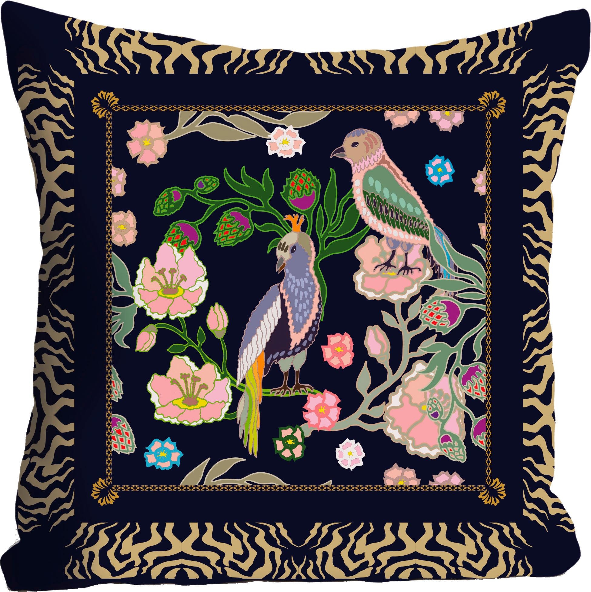 Einen verspielten Akzent in den eigenen vier Wänden setzt diese farbenfrohe Kissenhülle »Vögel«. Sie zeichnet sich durch ein auffälliges Design und ein detailreich gestaltetes Muster aus. Das Motiv zeigt bunte Vögel, abstrakte Blüten und Ornamente, die durch den schlichten Untergrund wirkungsvoll zur Geltung kommen. Einen schönen Platz findet der dekorative Bezug auf der Couch, dem Sessel oder im Bett. Da er über einen praktischen Reißverschluss verfügt, lässt er sich unkompliziert auf- und abziehen. Bei Bedarf kann die Dekokissenhülle gewaschen werden. Ein echter Hingucker: die farbenfrohe Kissenhülle »Vögel«. Mit diesem Produkt werten Sie Ihr Zuhause stilvoll auf.