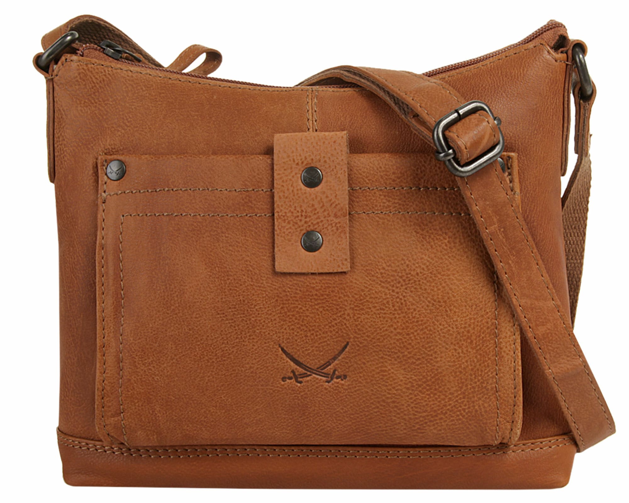 Lässige Leder Umhängetasche von Sansibar. Rustikale Sattlernähte und dezente Nietendetails ergänzen den Vintage Look des Leders. Das elastische Hauptfach lässt so einiges im Inneren verschwinden. Weitere Innen- und Außenfächer bieten zusätzlichen Stauraum. Mit einem Gewicht von nicht einmal 500 Gramm ist die Tasche wunderbar leicht. Das kultige Sansibar Logo, die zwei gekreuzten Säbel, ziert die Vordertasche sowie das Innenfutter.