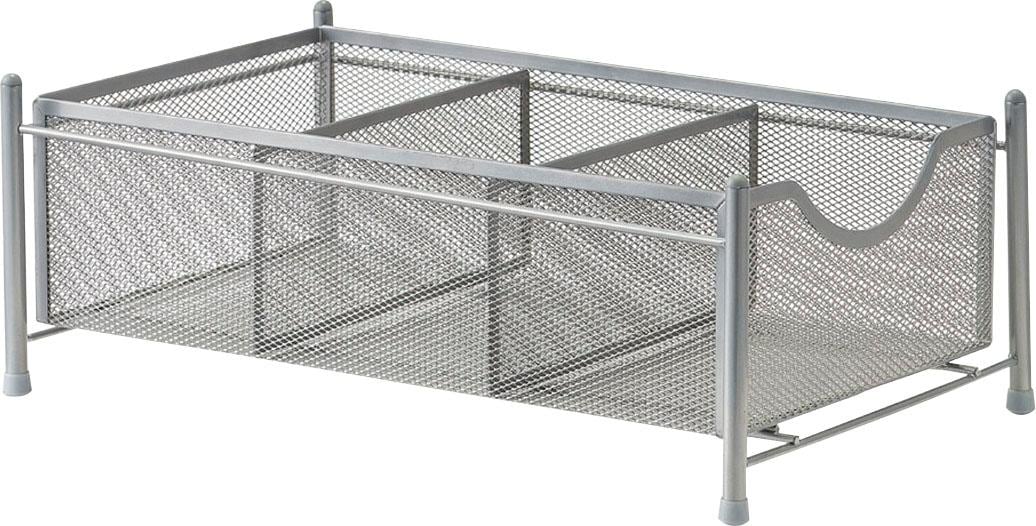 Ob im Büro für Kleinutensilien oder in der Küche für Vorratsgläser und Gewürze - unser Organizer aus Mesh ist vielseitig einsetzbar. Er verfügt über drei gleichgroße Fächer auf die, dadurch dass der Behälter herausgezogen werden kann, einfach zugegriffen werden kann. Die vier gummierten Füße des Gestells sorgen für einen sicheren Stand, sodass der Korb auch im befüllten Zustand sicher steht.