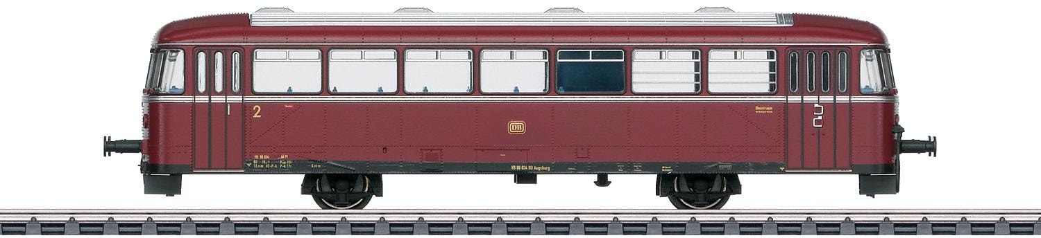 Schienenbus-Beiwagen mit Dienstabteil Baureihe VB 98 der Deutschen Bundesbahn (DB). In purpurroter Ursprungsfarbgebung. Beiwagen-Betriebsnummer VB 98 034. Betriebszustand Anfang der 1960er-Jahre. Beiwagen passend zu der aus Motorwagen und Steuerwagen bestehenden Schienenbus-Garnitur 39978. An beiden Enden in Kinematik geführte Schächte für stromführende Steck-Kupplungsdeichseln. Eine stromführende Kupplungsdeichsel liegt bei. Wagen-Innenraum mit freiem Durchblick. Inneneinrichtung. Innenbeleuchtung mit wartungsfreien warmweißen Leuchtdioden (LED). Stromversorgung der Innenbeleuchtung über stromführende Kupplungsdeichsel vom Triebfahrzeug.