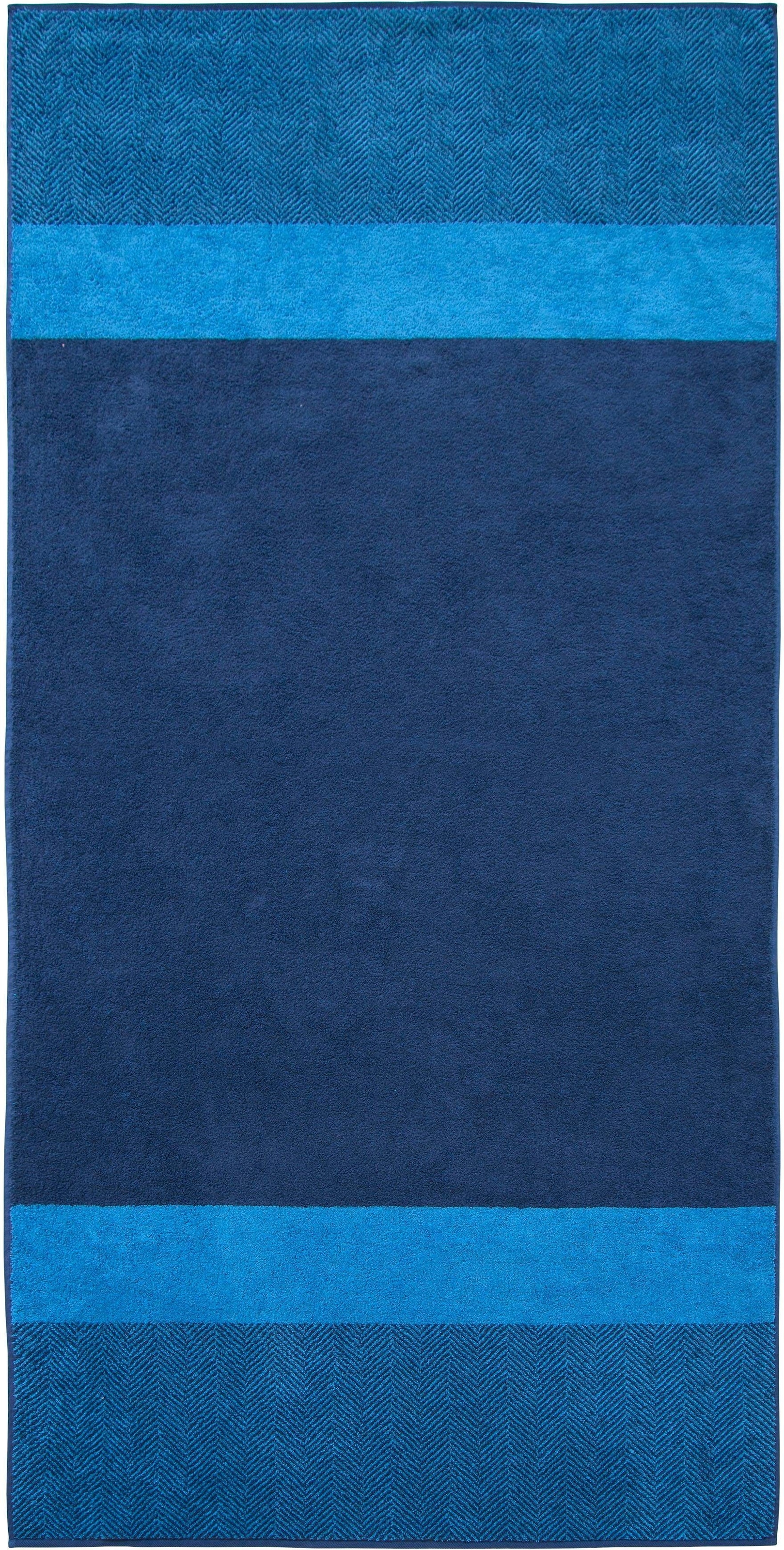 Das XXL Saunatuch TWO-TONE STRIPE „Made in Germany“ in harmonischen Blautönen mit modernem Fischgratmuster kommt ganz bewusst ohne prägnanten Sauna-Schriftzug aus. Auf Grund dieser modernen Einfachheit und seiner überdimensionalen Größe von 100 x 200 cm ist es daher auch als Strandbegleiter im Urlaub bestens geeignet. Aber dieses tolle XXL Tuch kann noch mehr: im Sommer ist es das perfekte Liegetuch fürs Freibad oder den Badesee und es ersetzt sogar die Picknickdecke, da gleich mehrere Personen bequem darauf sitzen können. Zum TWO-TONE STRIPE Saunatuch passen die SIENA Farben tintenblau, azur und weiß
