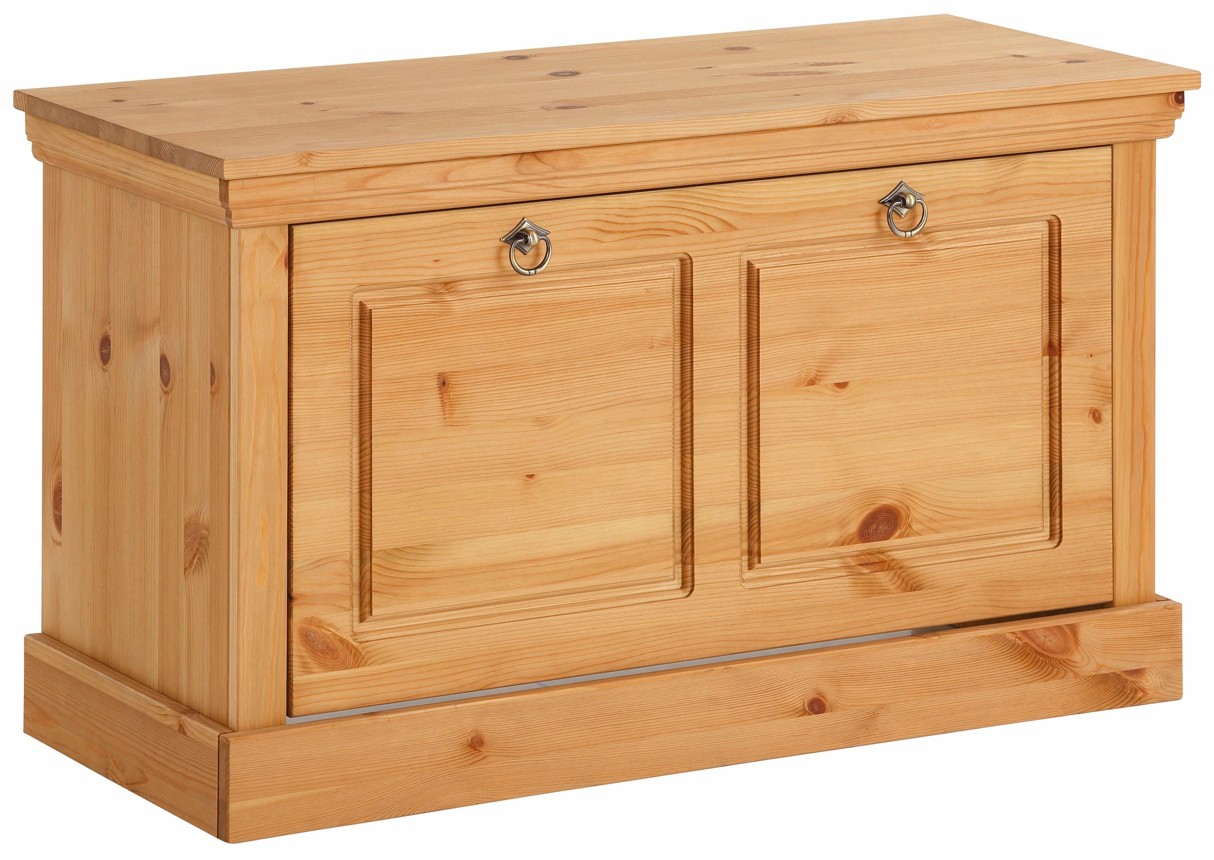 | Wissenswertes | Das Dielenmöbelprogramm »Basilico« ist aus massiver Kiefer gefertigt. Wahlweise in den Farben gelaugt/geölt oder weiß-grau (Holzstruktur sichtbar). Die Sitzbank bietet hinter der Klappe Stauraum für Schuhe oder andere Dinge. Die Griffe und Scharniere sind aus Metall.       Details:
