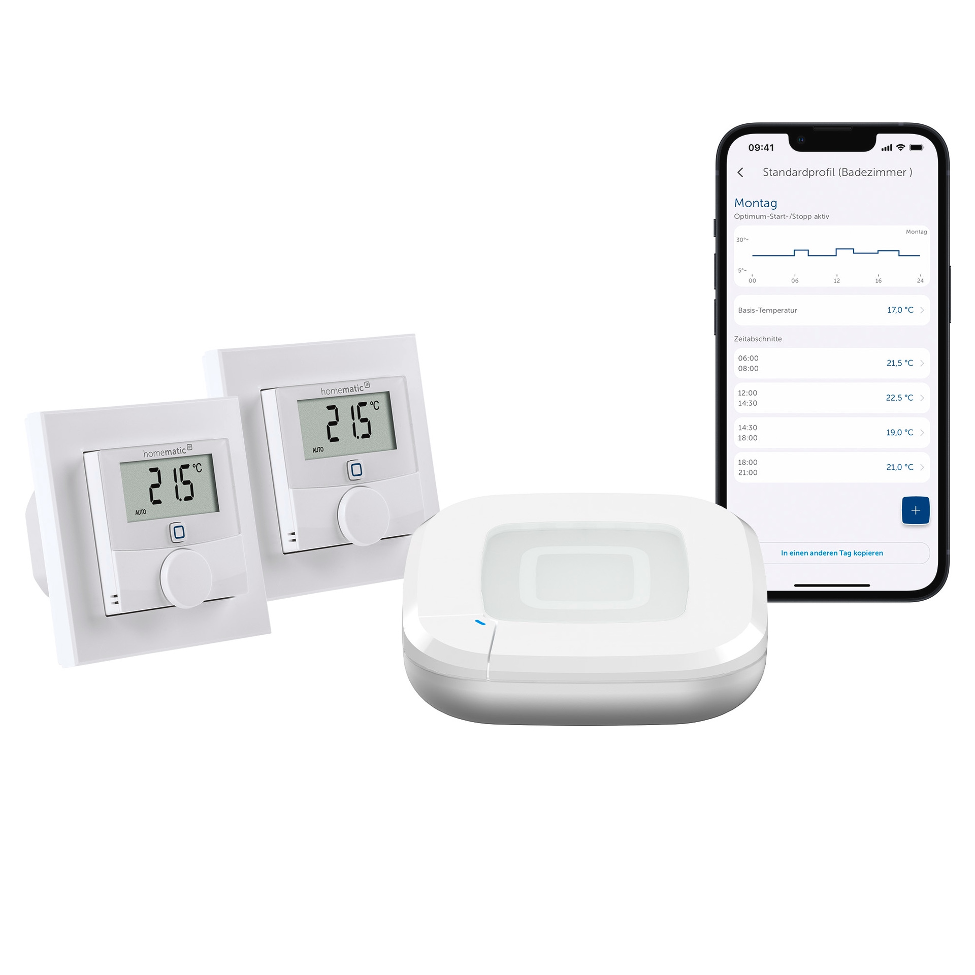 • Individuelle Temperaturverläufe können einfach per App erstellt werden – mit bis zu 3 einstellbaren Heizprofilen und 13 Änderungen pro Tag.