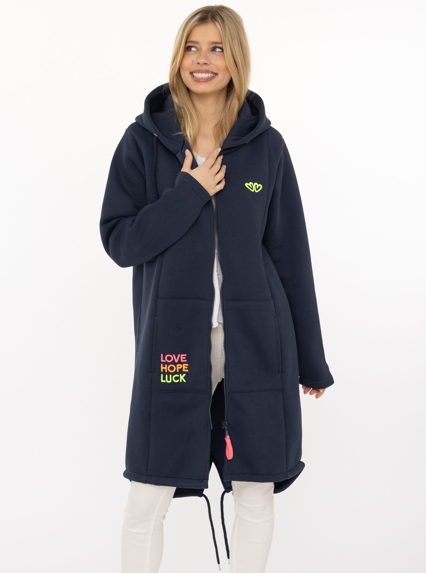 Neu - Jerseymantel Regular Fit, Langarm, Kapuze, Reißverschluss, Neon-StickereiZwillingsherzUrsprünglicher PreisUVP 89,99 €Rabatt- 17 %Aktueller Preisab 73,99 €
